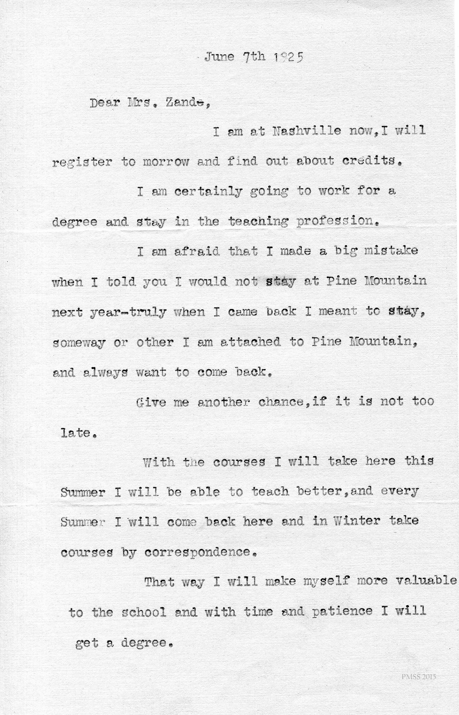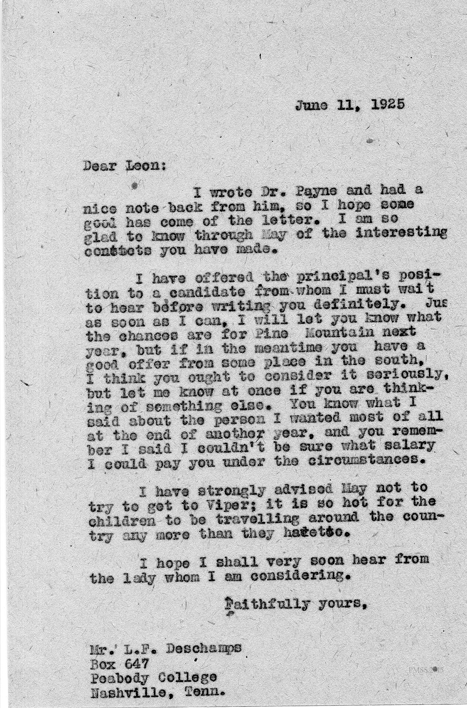 “Leon” (Deschamps) from Peabody College, Nashville, TN, to Zande: Will work for a degree and stay in teaching: Still interested in staying at Pine Mt.