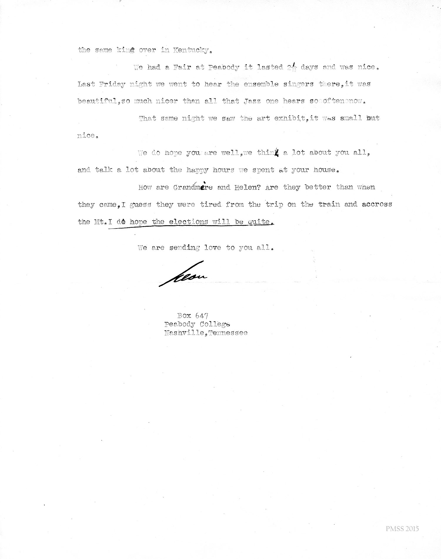 [unsigned] “EZ” (Ethel Zande) to “Friends” at Peabody College, Nashville, TN: Asks for information.
