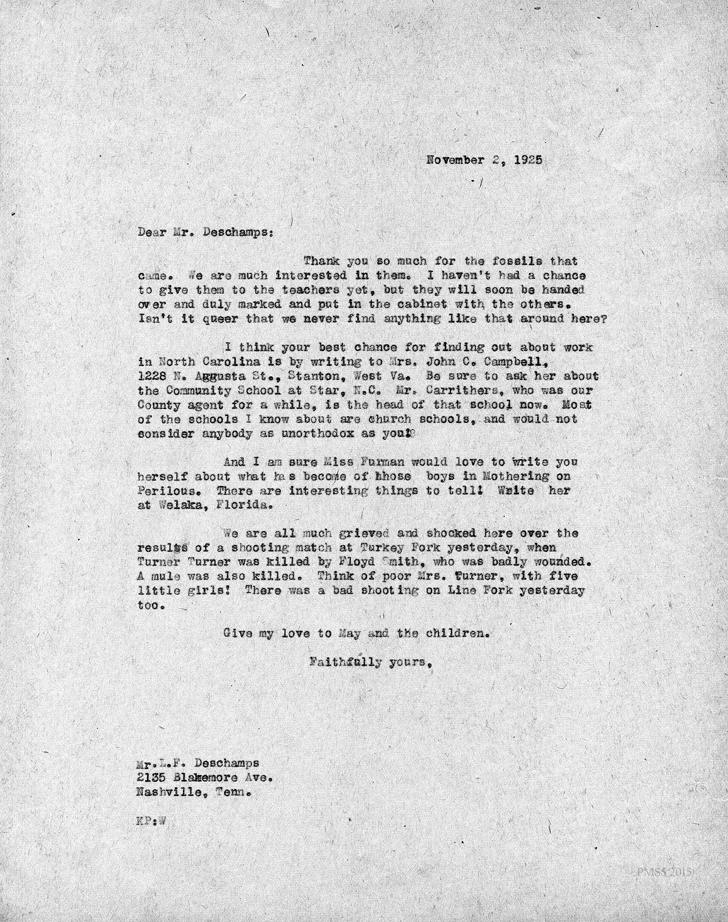 [unsigned] “KP” (Katherine Pettit) to Deschamps: fossils; ask Mrs. John C. Campbell about work in NC; ask about Community School at Star, NC; write to Miss Furman in FL; shooting at Turkey Fork involved [ ?] Turner and Floyd Smith.