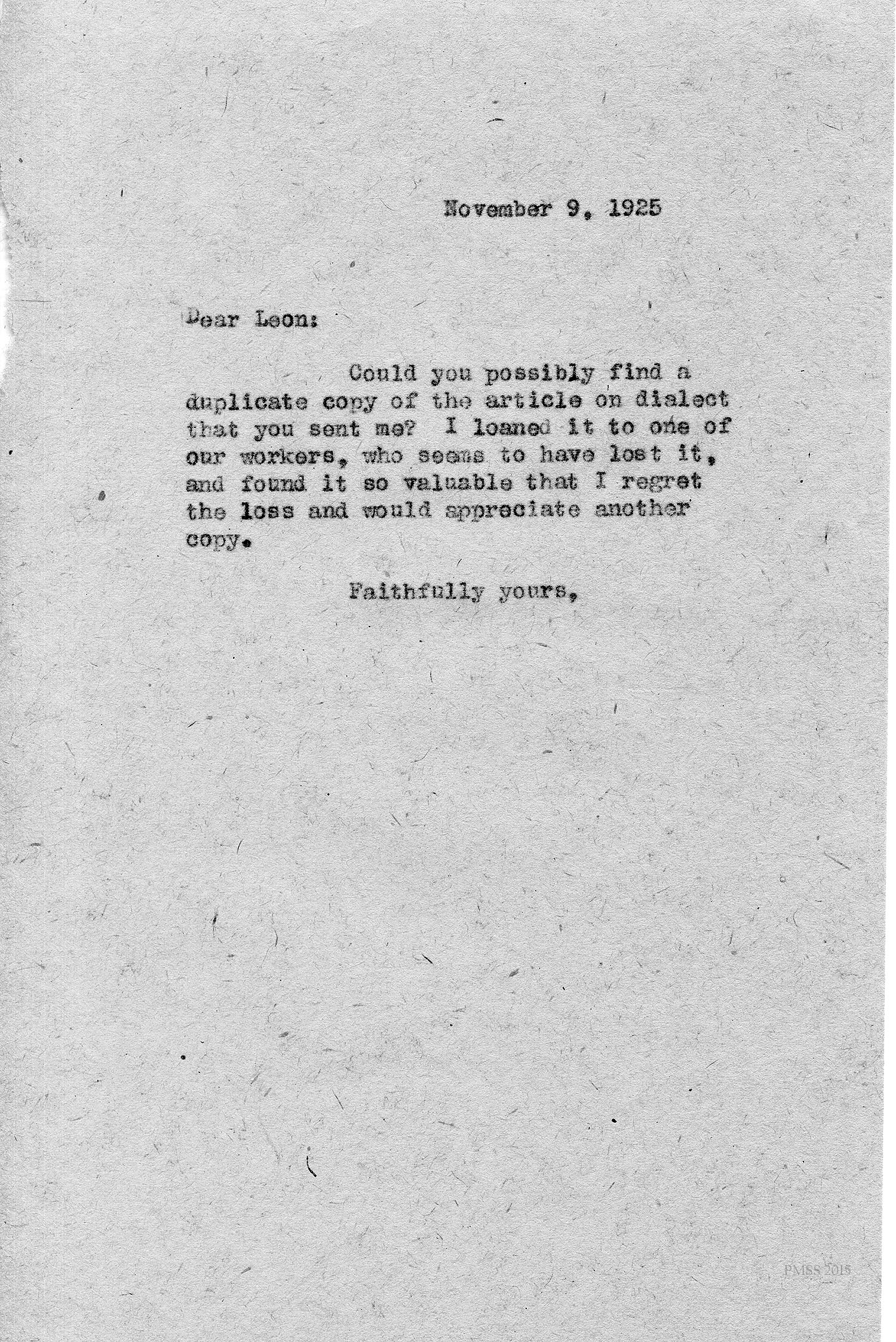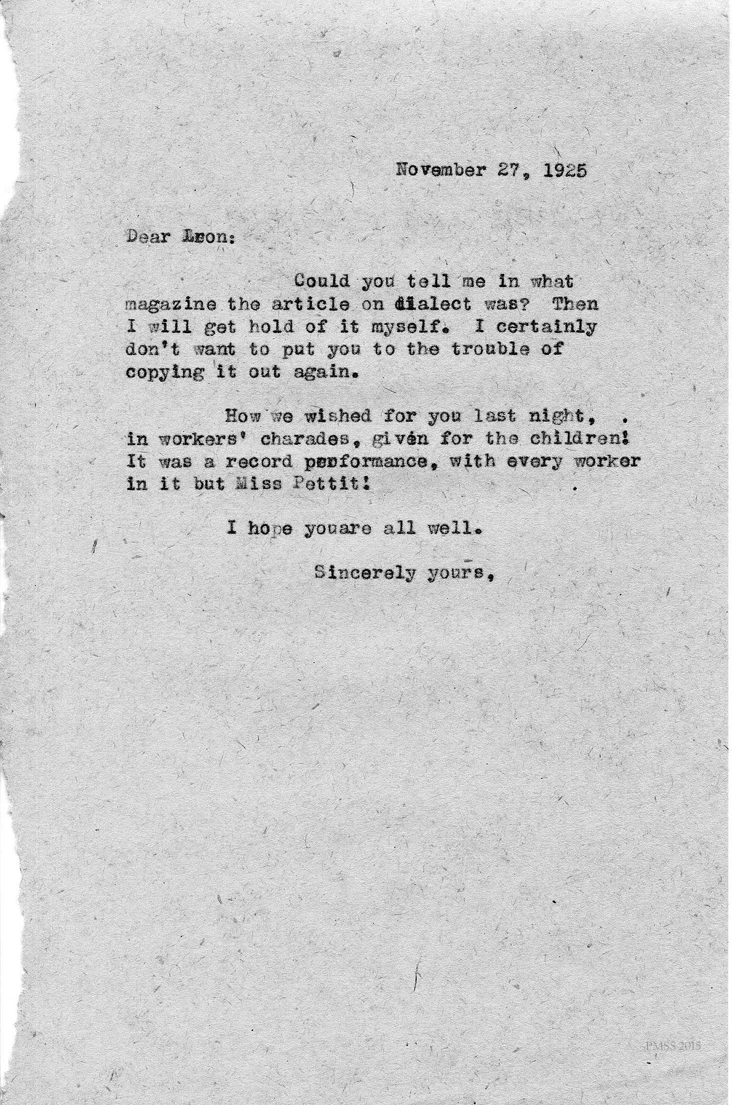 [unsigned] “EZ” (Ethel Zande) to “Leon”: Article on dialect; will send box of things for family; Hugh Irvin died; Uncle John & Aunt Louise; carols.1926 & 1927
