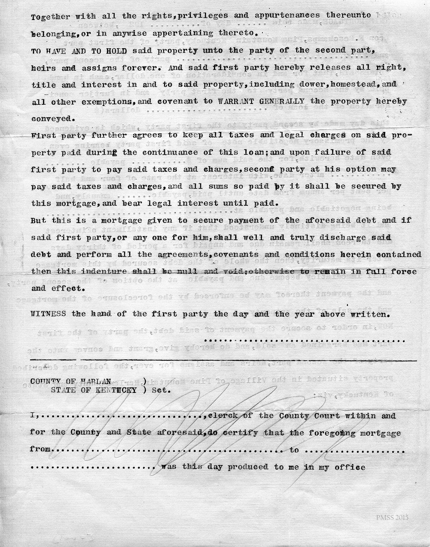 Draft of a mortgage statement (with blanks) indicating that Deschamps would sign over his mortgage on a Pine Mt. property to (blank, possibly PMSS) in order to pay his debt, if he doesn’t pay the debt in thirty days.
