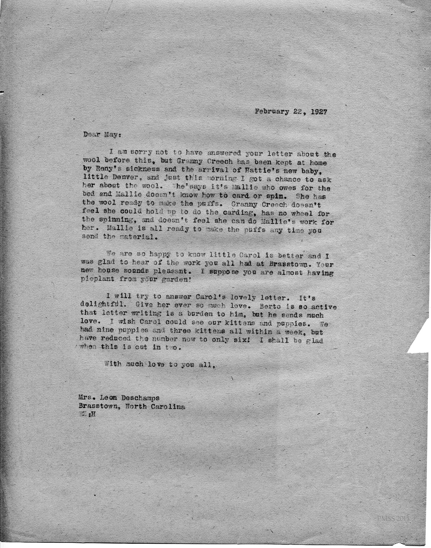 [unsigned] “EZ” (Ethel Zande) to “May” (Deschamps) in Brasstown, NC: Granny Creech; Reny; Hattie’s new baby, Denver; Mallie ready to make the puffs when May sends the wool: Carol; Berto.