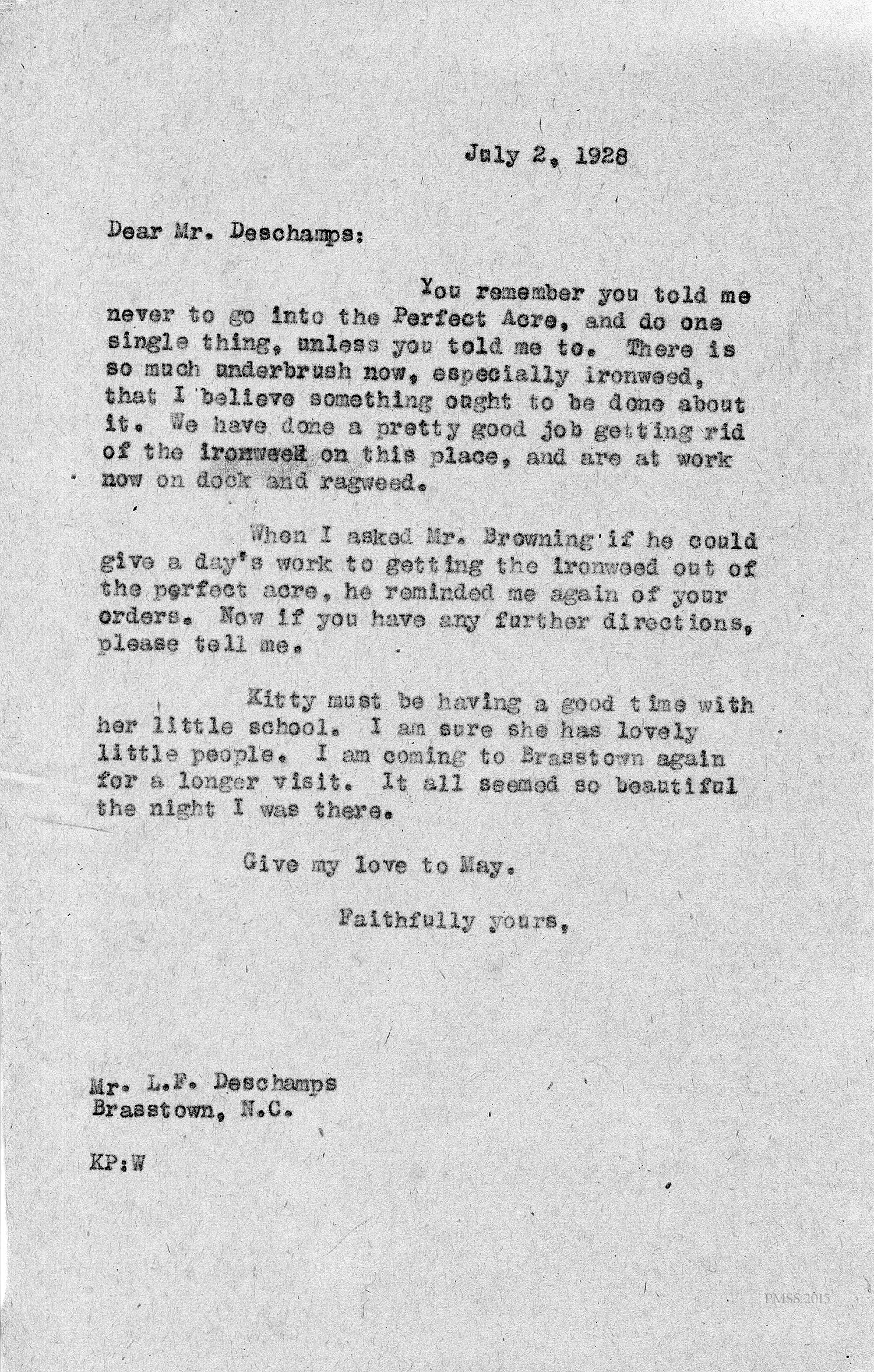 [unsigned] “KP” (Katherine Pettit) to Deschamps: Asks Deschamps permission to clear underbrush from the Perfect Acre; ironweed, dock, ragweed; Mr. Browning; Kitty; KP’s visit to Brasstown.