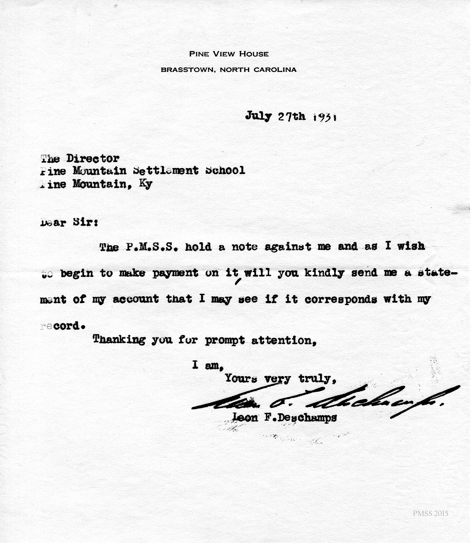 Evelyn Wells, Secretary, Pine Mt. School “to whom it may concern”: Draft letter of recommendation for Deschamps.