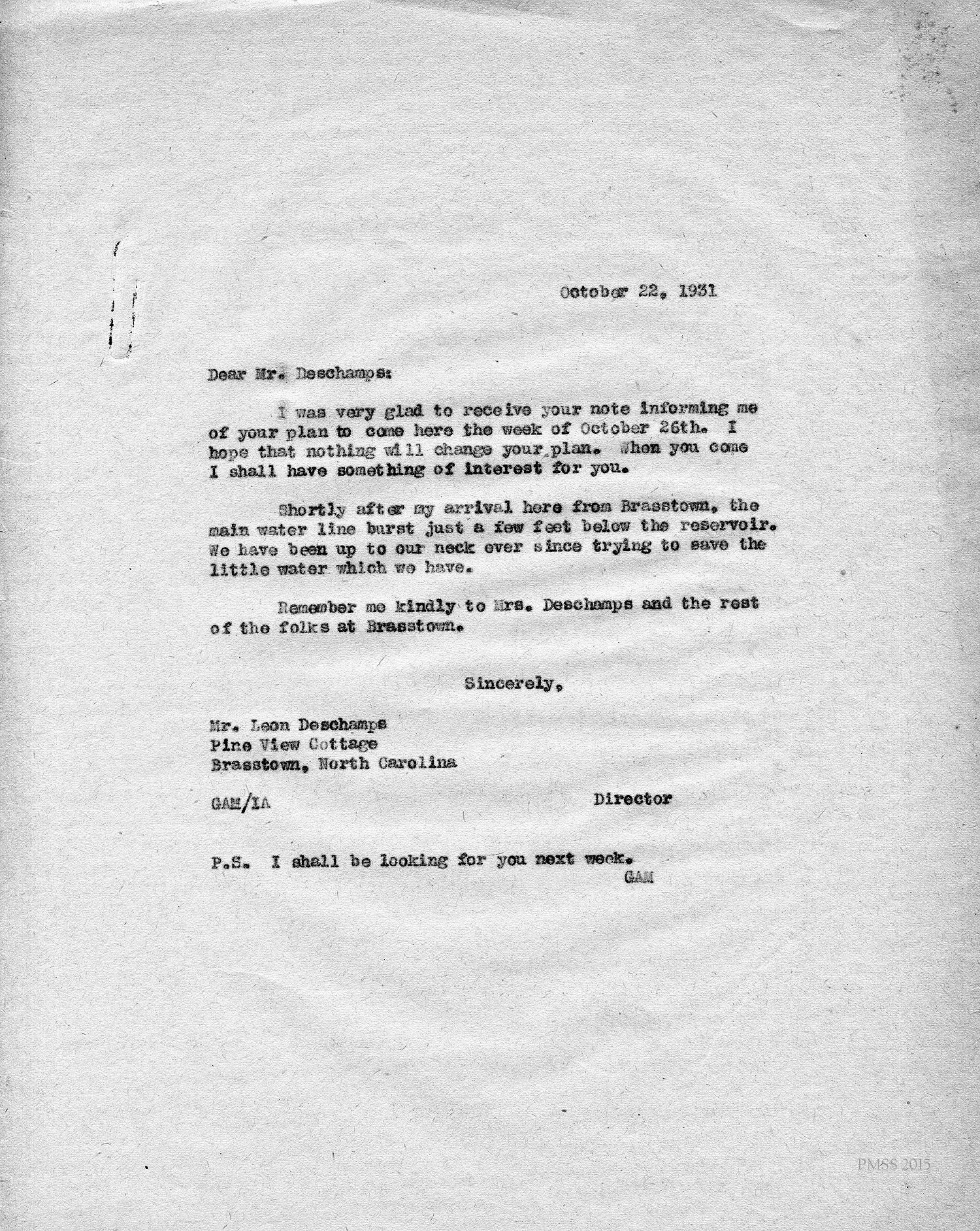 [unsigned] “GAM” (Glyn Morris, Director) to Deschamps: Welcomes him to PMSS for a week’s visit; reservoir’s main water line has burst.