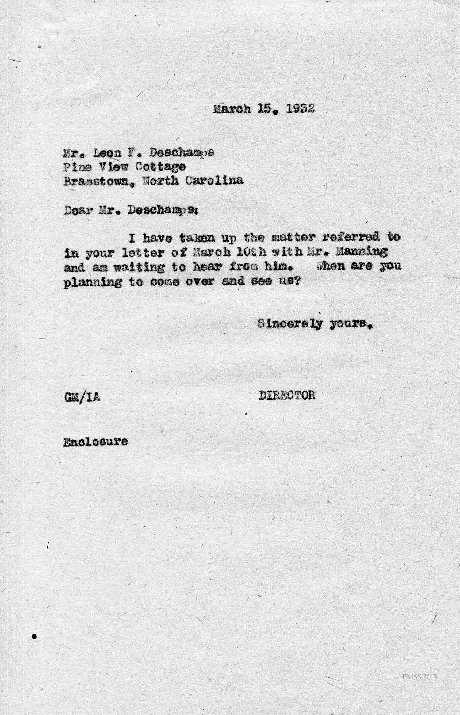 NOTE: All letters to Deschamps are typewrItten carbon copies for the Office files, therefore usually unsigned. The addressees would have received the signed original letters.