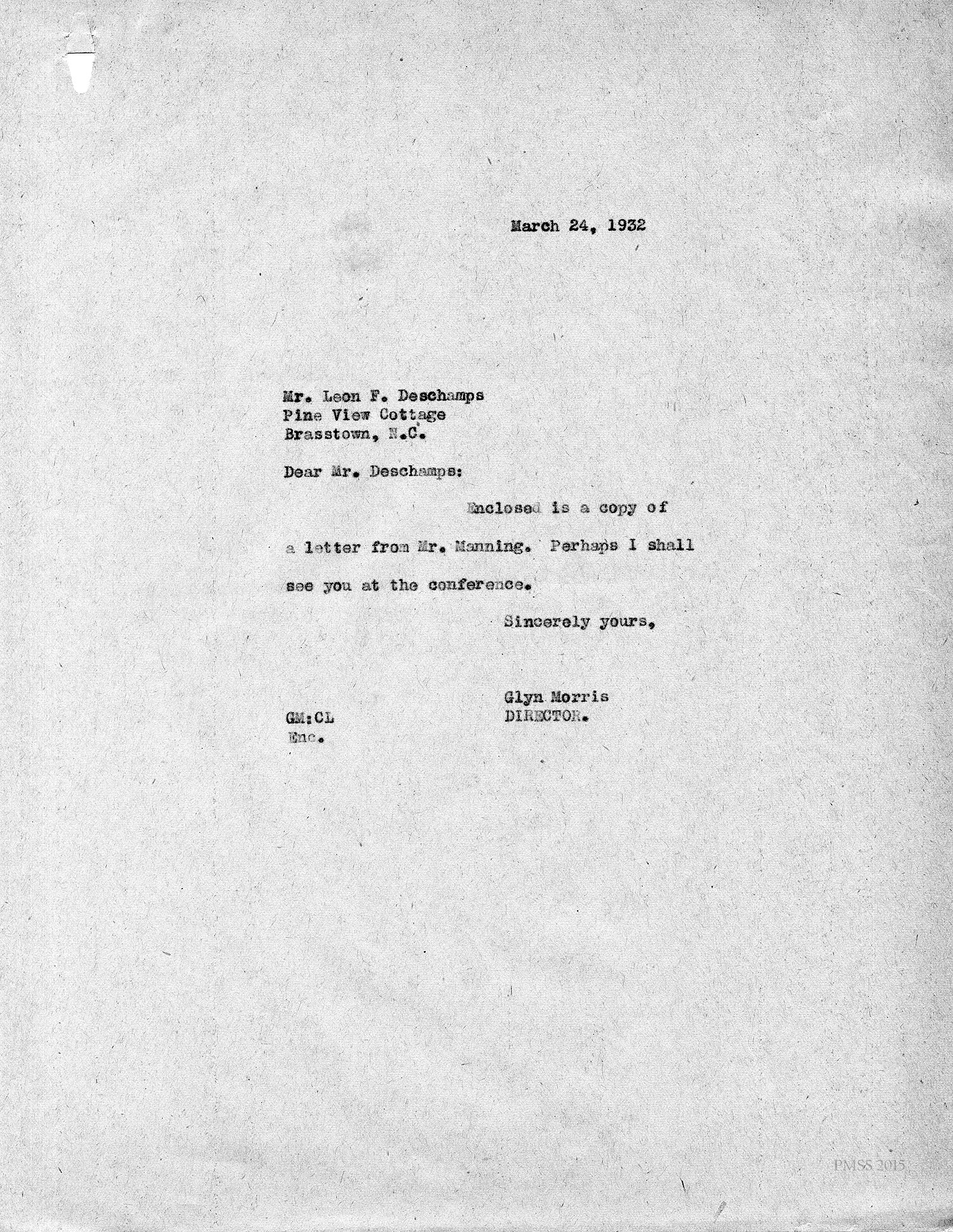 Manning to Morris: Re-negotiates Deschamps’ request; handwritten notation indicates forwarding this letter to Deschamps.