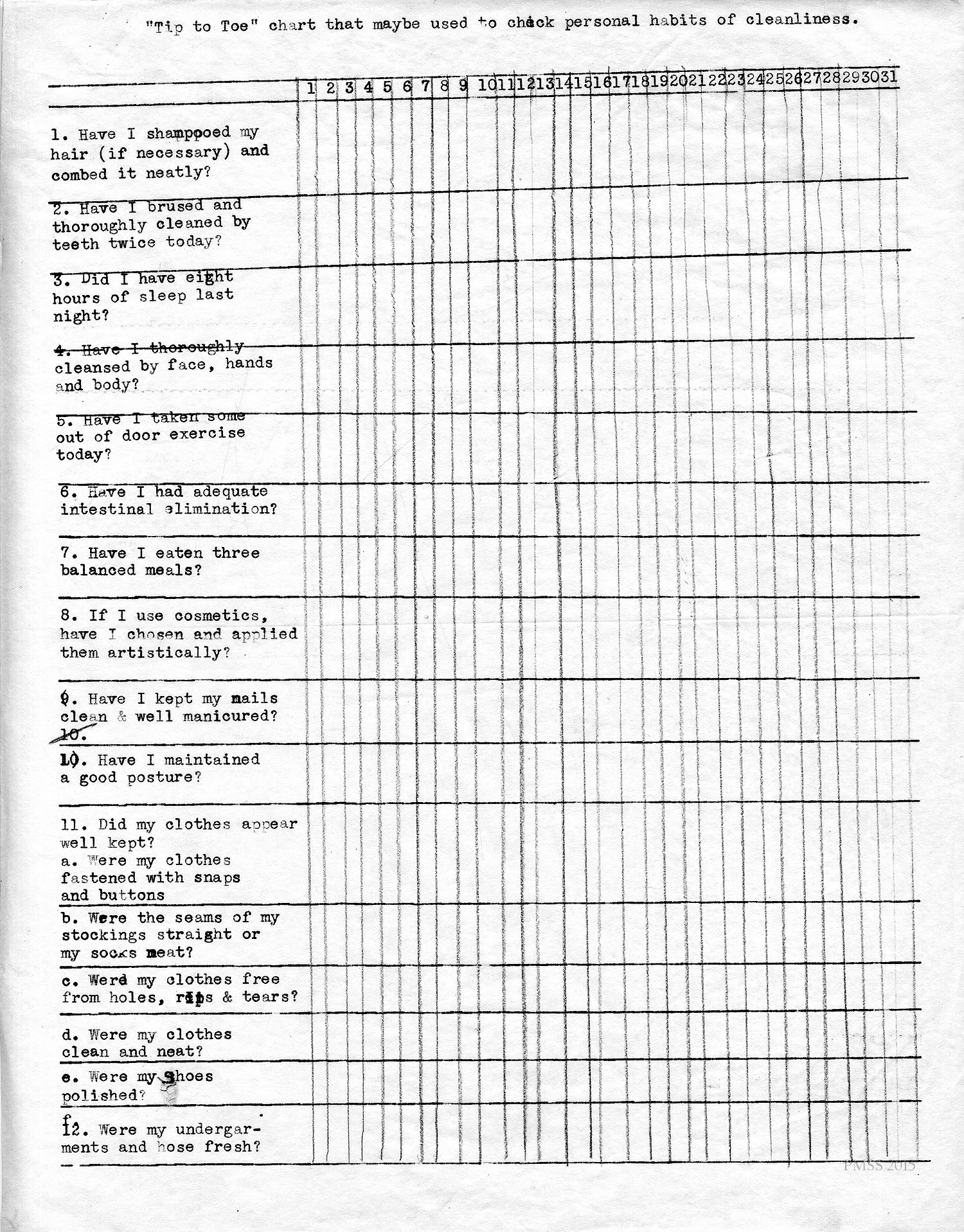 “‘Tip to Toe’ chart that may be used to check personal habits of cleanliness.” Consisted of a daily checklist covering hair, teeth, sleep, washing, exercise, intestinal elimination, meals, cosmetics, nails, posture, clothing. [goins_a_food_001.jpg]