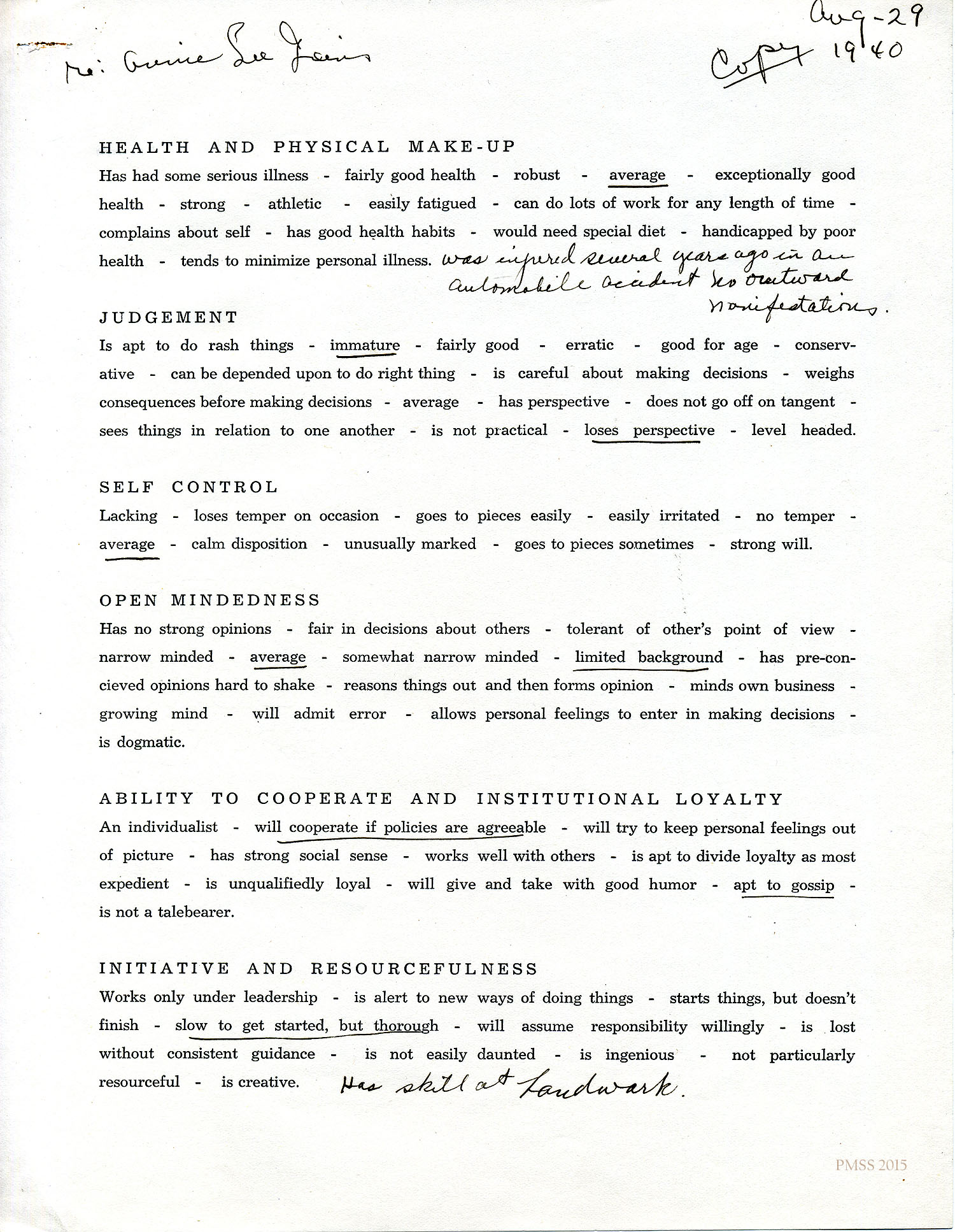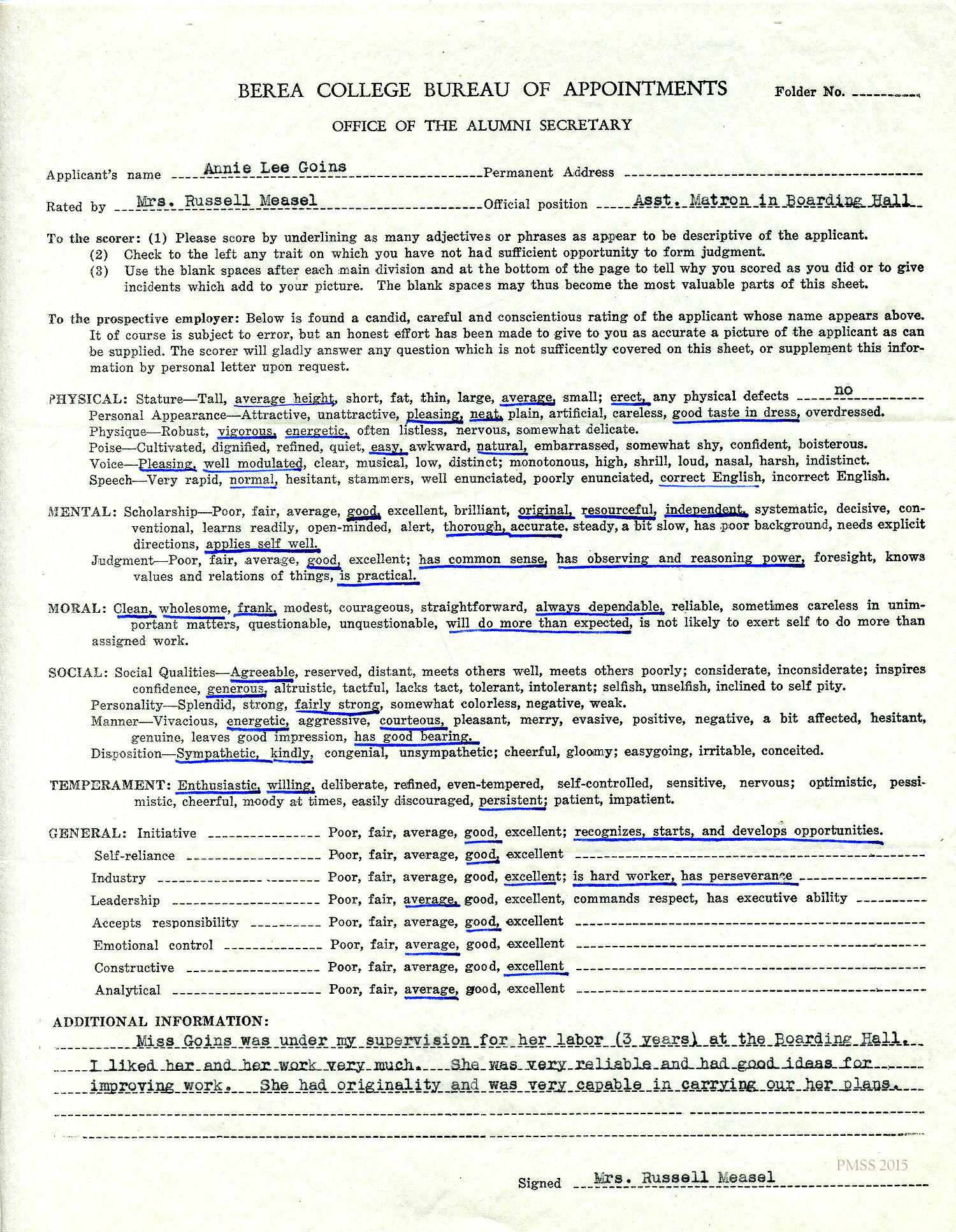 n.d. Form: “Berea College Bureau of Appointments, Office of the Alumni Secretary”. Mrs. Russell Measel, Asst. Matron in Boarding House, underlined characteristics that she felt applied to Annie Lee Goins in such categories as physical, mental, moral, social, temperament, general. [003]