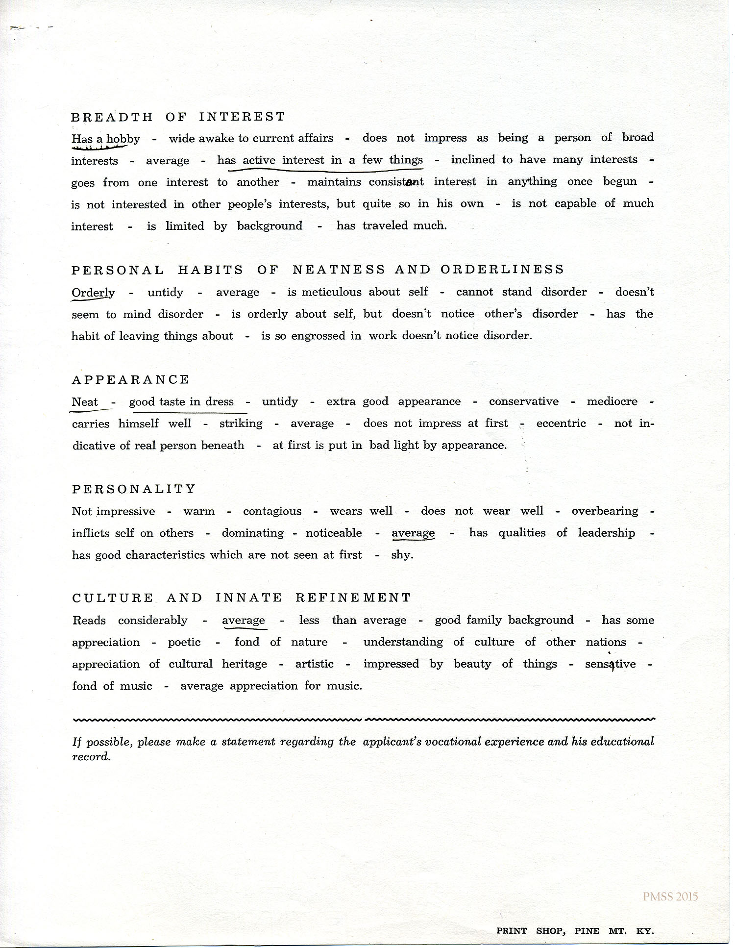 n.d. Application Rating Form: Underlined by an unnamed reference, indicating applicant’s interests, personal habits, appearance, personality, and culture. [001]