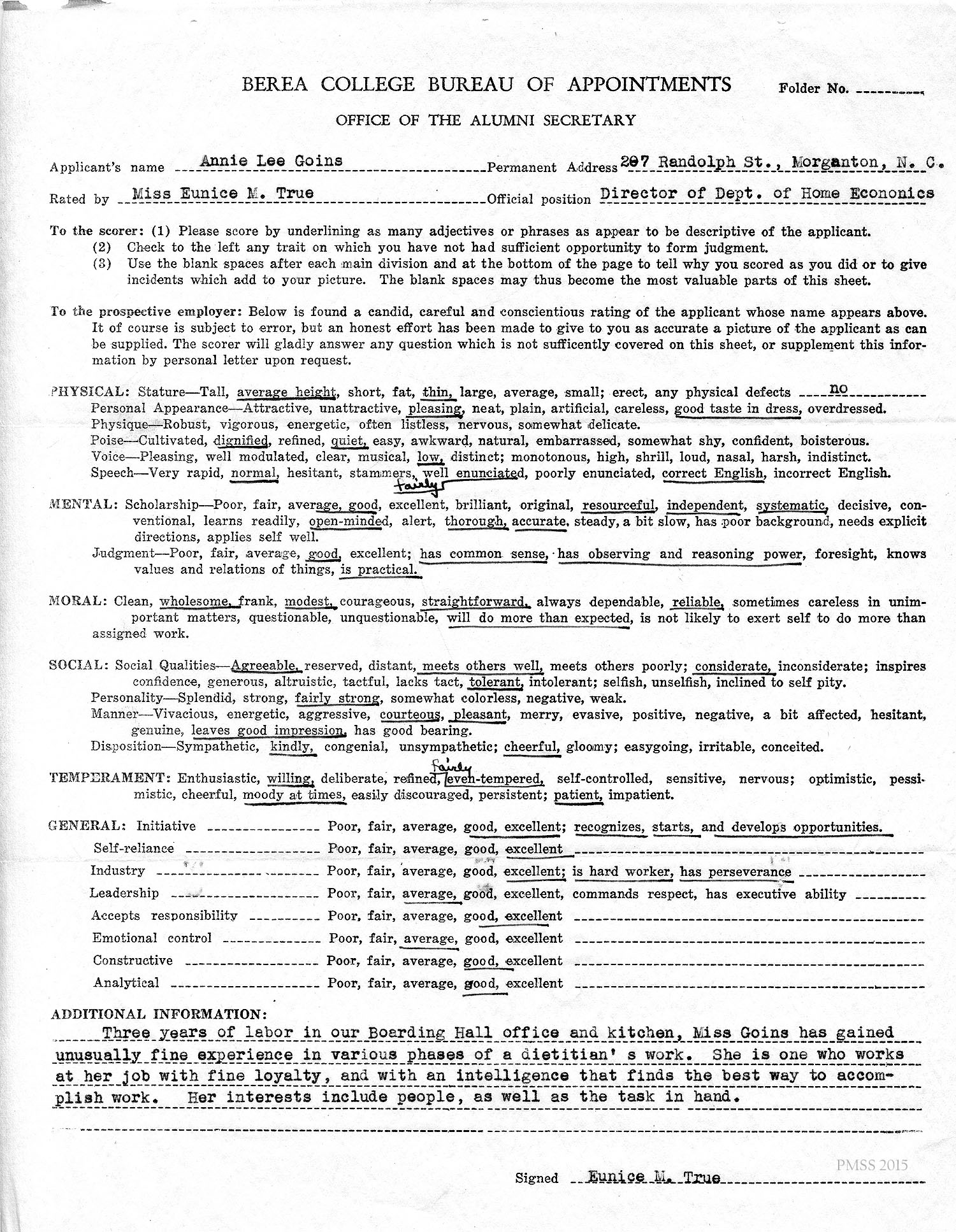 n.d. Form: “Berea College Bureau of Appointments, Office of the Alumni Secretary”. Miss Eunice M. True, Director of Dept. of Home Economics, underlined characteristics that she felt applied to Annie Lee Goins. [005]