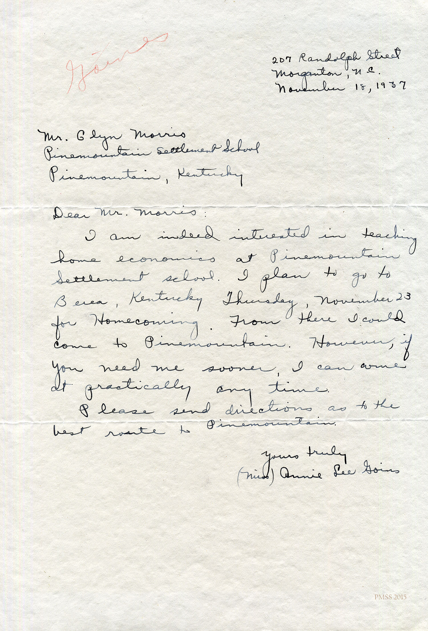 November 18, 1937. Handwritten letter from Miss Annie Lee Goins, Morganton, NC, to Mr. (Glyn) Morris. Expresses interest in teaching home economics at PMSS; will attend Berea Homecoming; asks for directions to PMSS. [006]