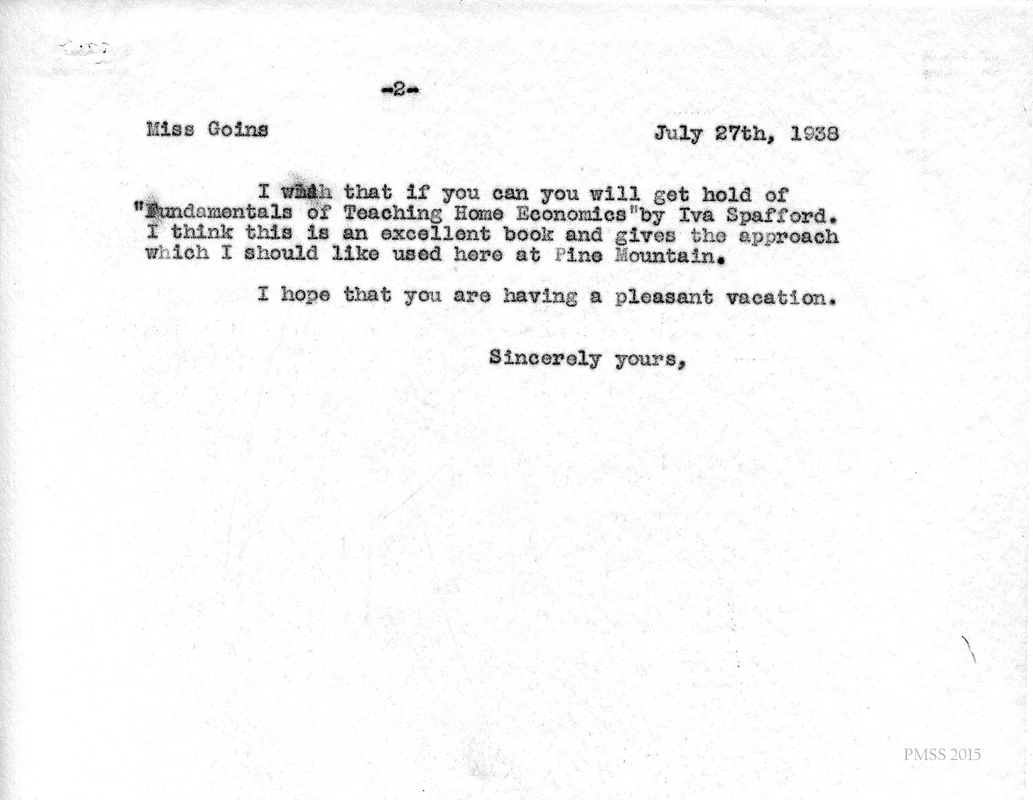 July 27, 1938. [Unsigned] ? to Miss Goins, Berea (KY) College. Encloses copy of Goins’ schedule; asks for an outline for home mechanics course for 2 groups; advises how and what to teach the groups; advises coordinating with the subjects covered by Mrs. Keith and Miss Hill; suggests reading “Fundamentals of Teaching Home Economics” by Iva Spafford. [009-009a]