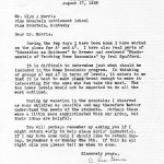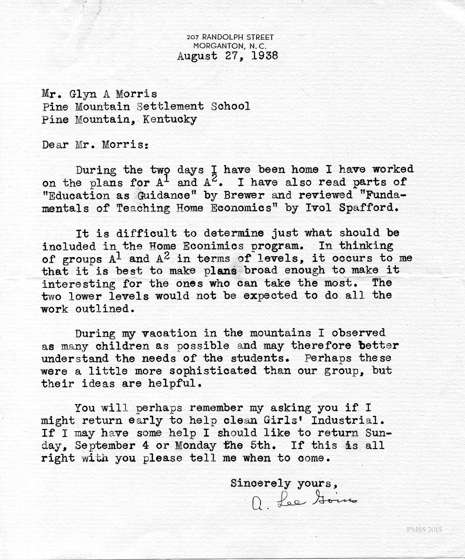 August 27, 1938. A. Lee Goins, Morganton, NC, to Mr. (Glyn) Morris. Describes her preparations and thoughts for teaching Home Economics; offers to return early to help clean Girls’ Industrial [Building]. [012]