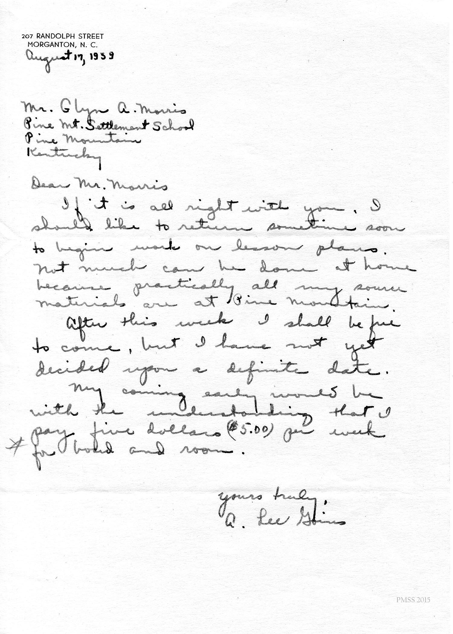 August 17, 1939. A. Lee Goins, Morganton, NC, to Mr. Morris. Asks to return early to begin lesson planning; will pay $5 a week for board and room. [016]