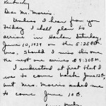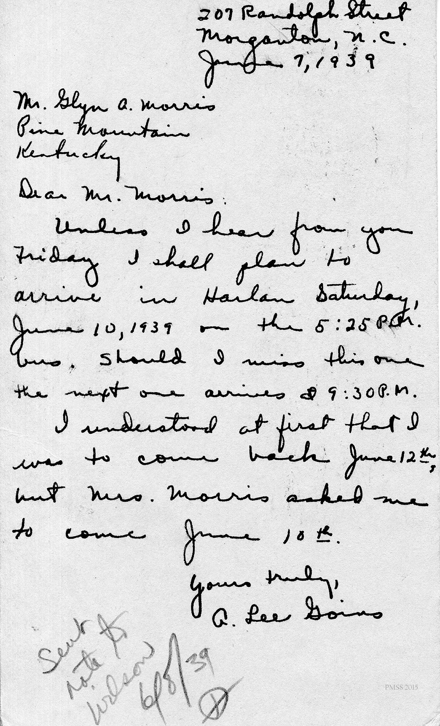 June 7, 1939. Handwritten by A. Lee Goins, Morganton, NC, to Mr. Morris. Describes her plans for arriving in Harlan. Handwritten notation: “Sent note to Wilson 6/8/39” [019]