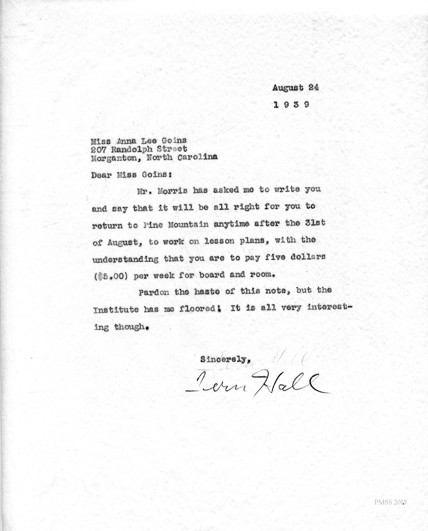 August 24, 1939. Fern Hall to Miss Goins, Morganton, NC. Morris has given Goins permission to return to P.M. early. [020]