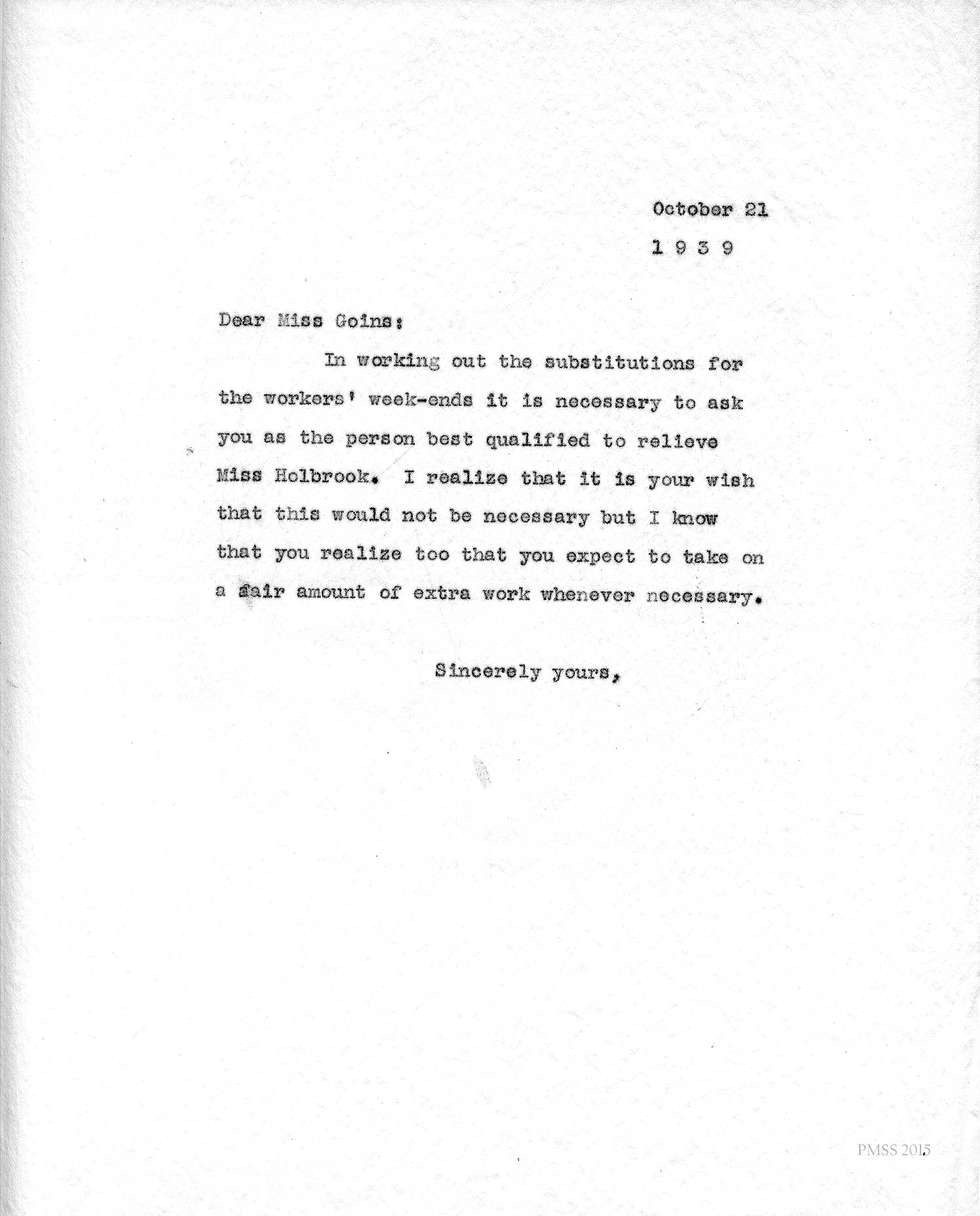 October 21, 1939. [Unsigned, probably Morris]. ? to Miss Goins. Arranges for Goins to relieve Miss Holbrook as weekend substitute. [021]
