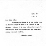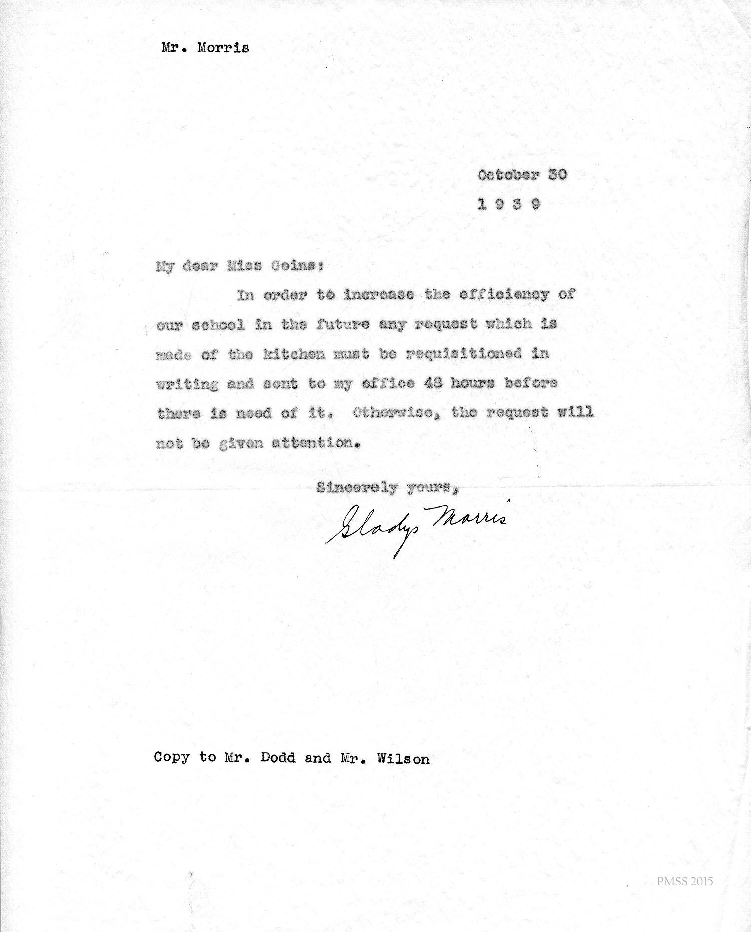October 30, 1939. Gladys Morris to Miss Goins. New rule for requests made of the kitchen. [022]