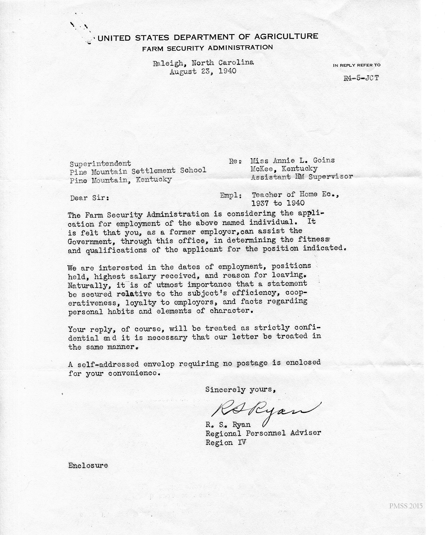 August 23, 1940. R. S. Ryan, Regional Personnel Advisor, Farm Security Administration, Raleigh, NC, to “Superintendent”, PMSS; Considering application from Annie L. Goins, McKee, KY; requests information concerning her employment with PMSS. [026]