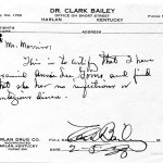 February 5, 1938. Prescription blank. Dr. Clark Bailey, Harlan, KY, to Mr. Morris. Certifies that he finds Annie Lee Goins with “no infections or contagious disease.” [015]