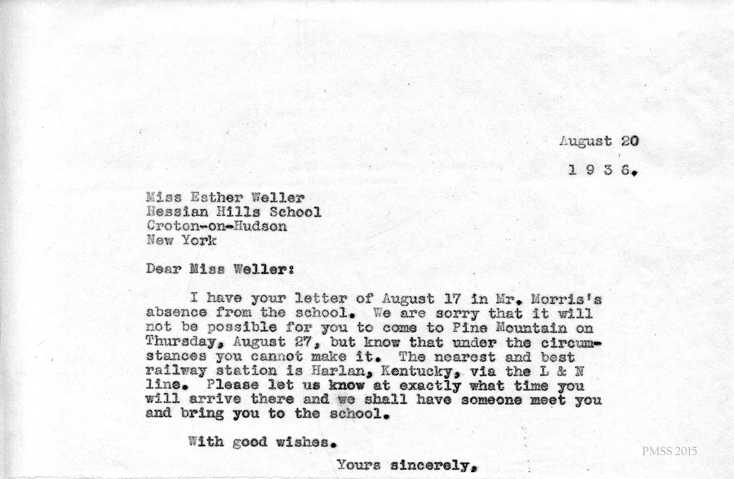 I have your letter of August 17 in Mr. Morris’s absence from the school. We are sorry that it will not be possible for you to come to Pine Mountain on Thursday, August 27, but know that under the circumstances you cannot make it. The nearest and best railway station is Harlan, Kentucky, via the L & N line. Please let us know at exactly what time you will arrive there and we shall have someone meet you and bring you to the school.