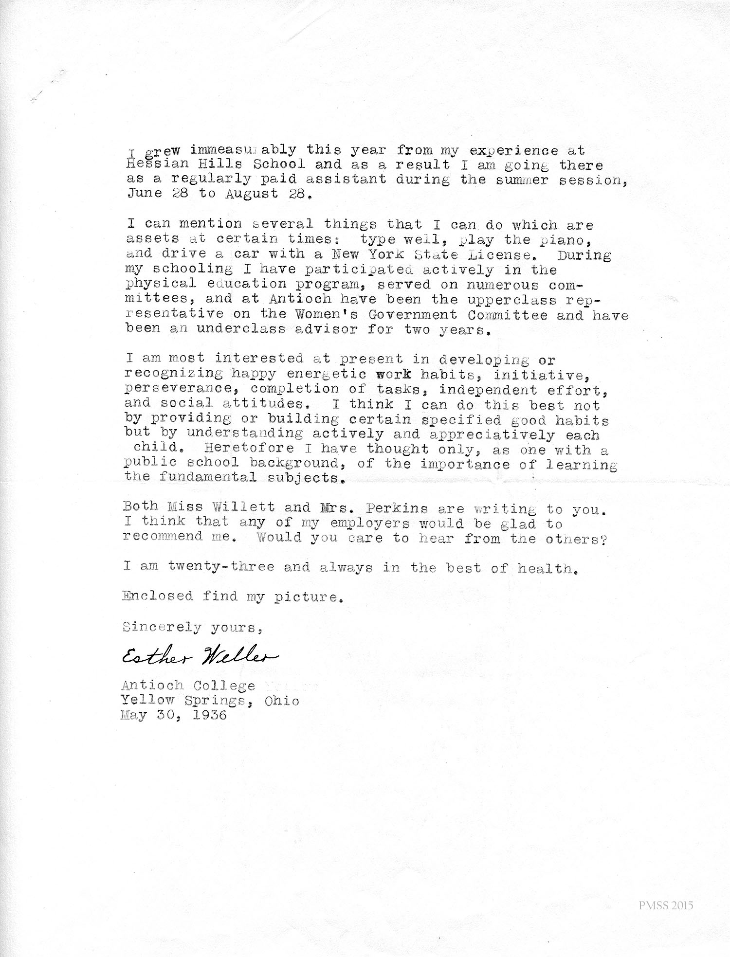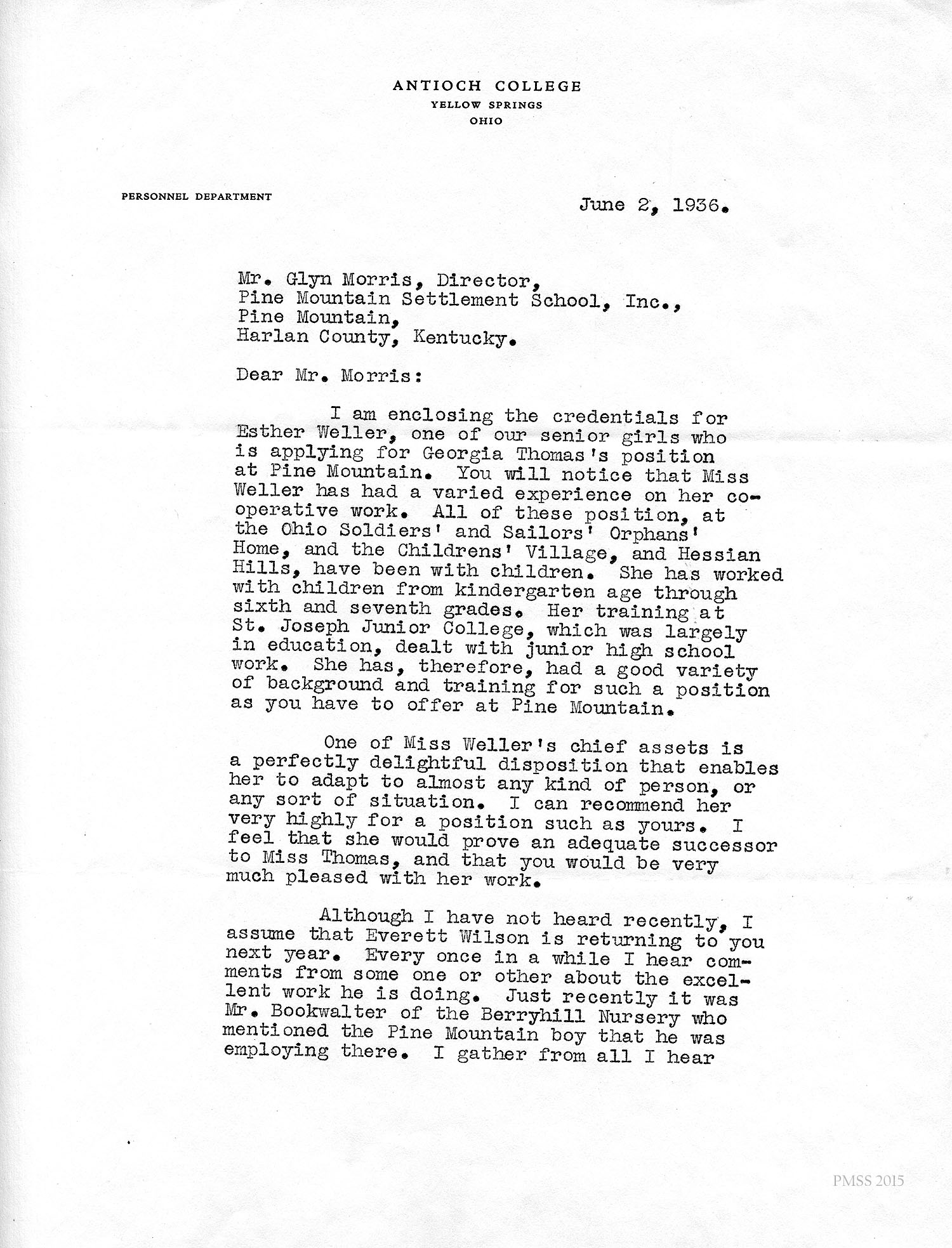 I am enclosing the credentials for Esther Weller, one of our senior girls who is applying for Georgia Thomas’s position at Pine Mountain. You will notice that Miss Weller has had a varied experience on her co-operative work. All of these positions, at the Ohio Soldiers’ and Sailors’ Orphans’ Home, and the Children’s Village, and Hessian Hills, have been with children. She has worked with children from kindergarten age through sixth and seventh grades. Her training at St. Joseph Junior College, which was largely in education, dealt with junior high school work. She has, therefore, had a good variety of background and training for such a position as you have to offer at Pine Mountain.
