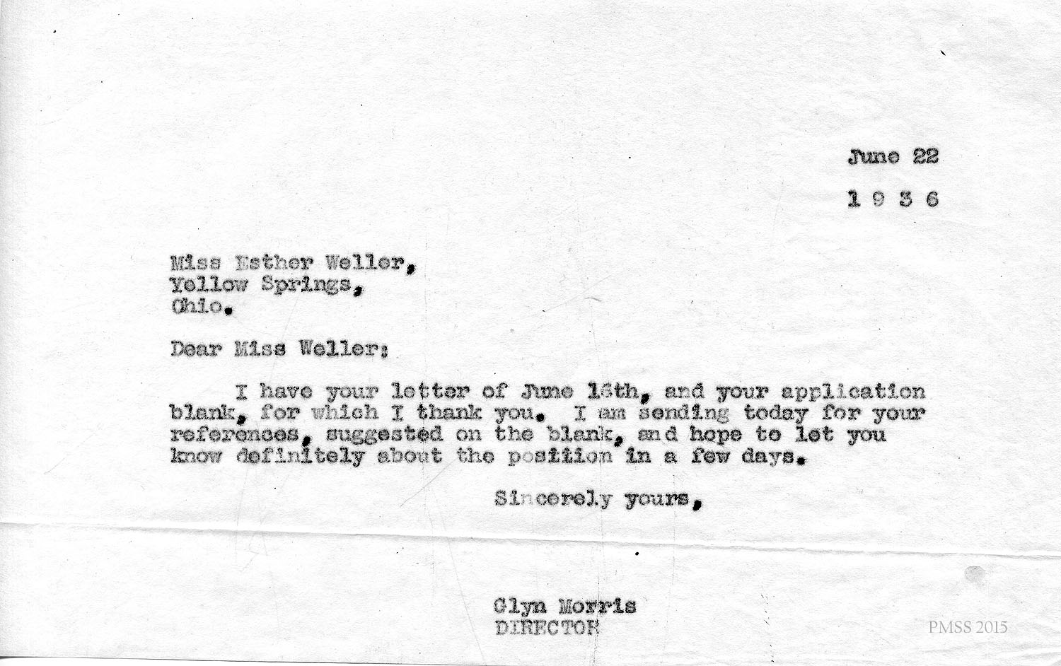 I was away from the campus when your telegram came, but my secretary got in touch with Miss Weller at once. Last Friday I had a letter from her saying she had written you accepting the position.