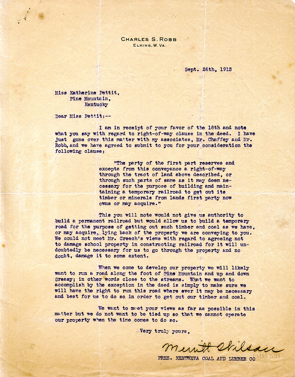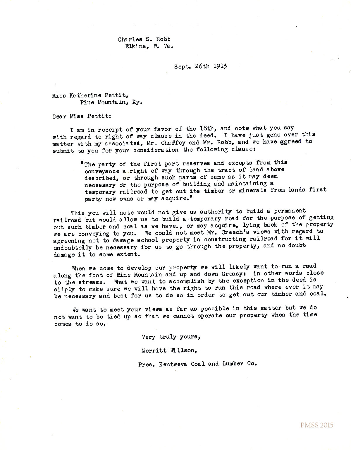 September 26, 1913. Merritt Wilson to Katherine Pettit [letterhead: Charles S. Robb, Elkins, W. Va.]. Sends revised right-of-way clause stating railroad will be temporary; cannot include Mr. Creech’s request not to damage school property. [033]