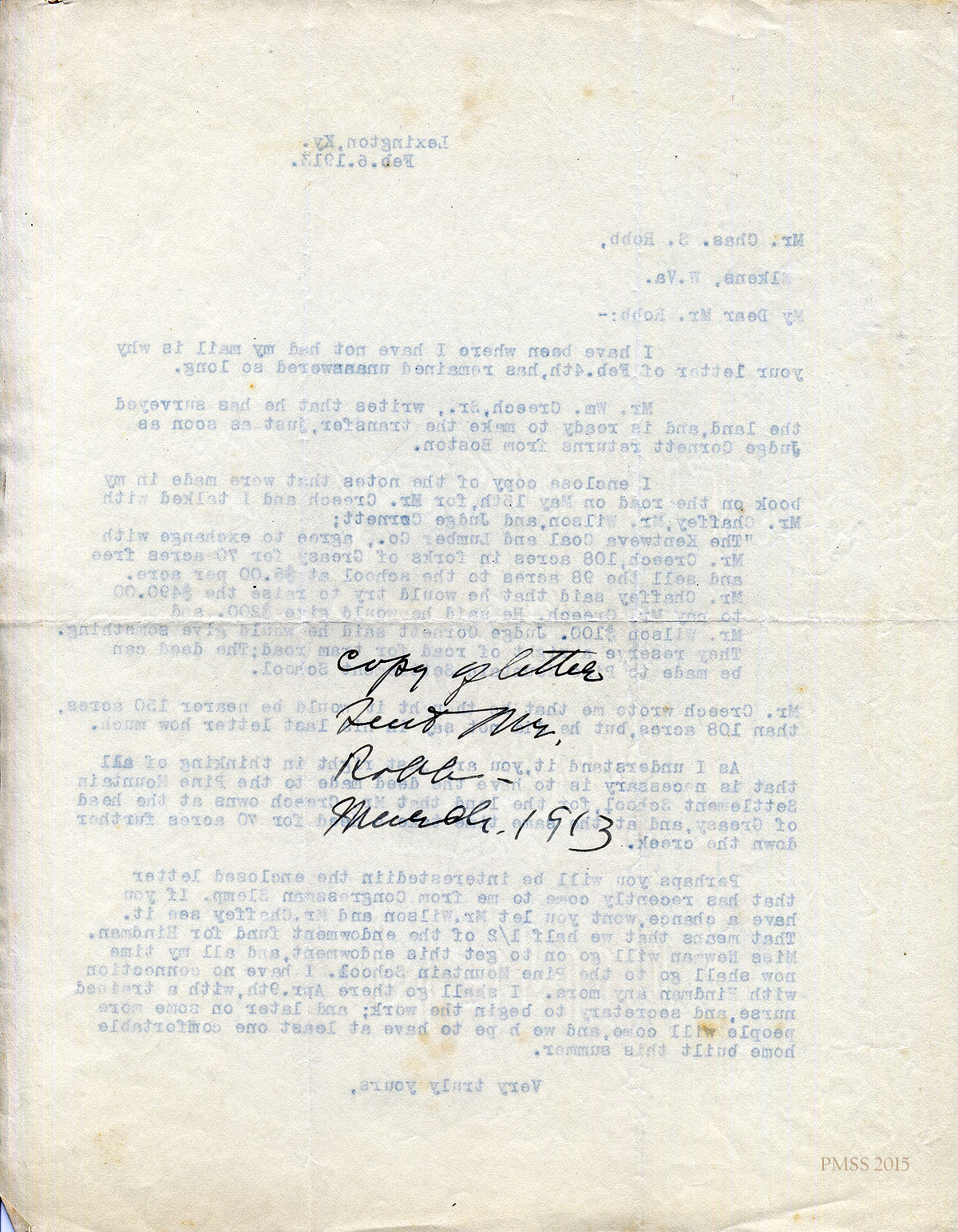 February 6, 1913. Katherine Pettit, Lexington, KY, to Charles Robb, Elkins, W. Va. Details of surveying and transferring Creech land to PMSS; leaving Hindman for P.M. [004]