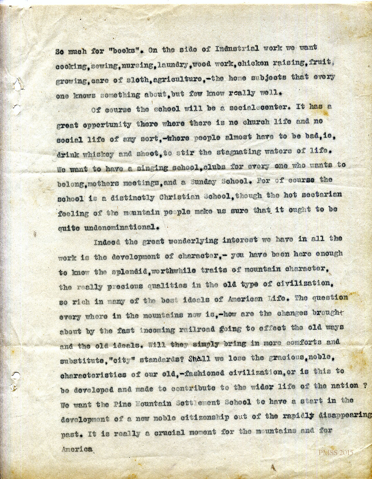 March 20, 1913. [unsigned] Katherine Pettit[?] to Miss Wilson. Describes plans for a mountain school: name of school, location, land donations, farming, buildings, board members, curriculum, mountain character; invites Miss Wilson to raise money for a model cottage for girls and join the staff. [006-011]