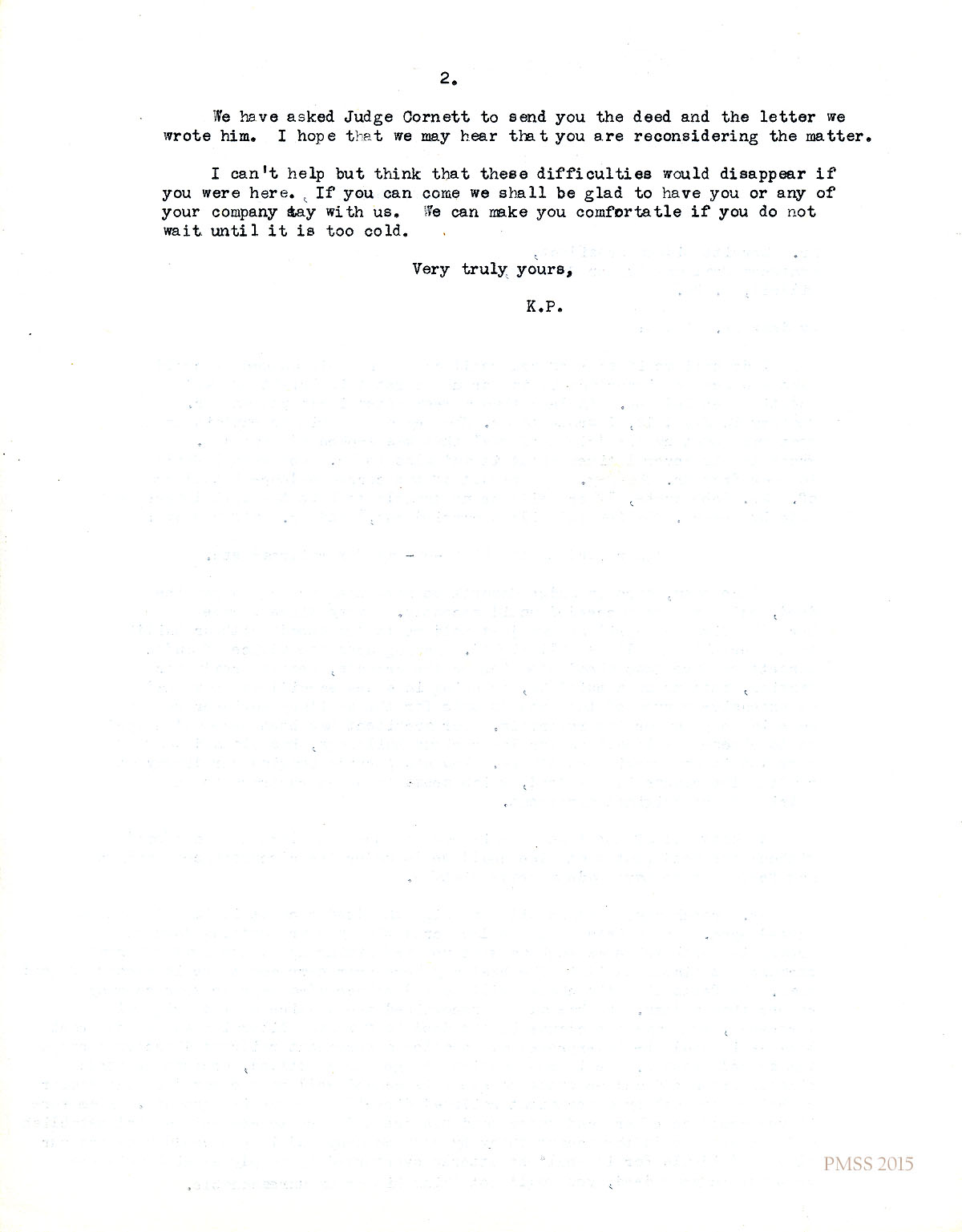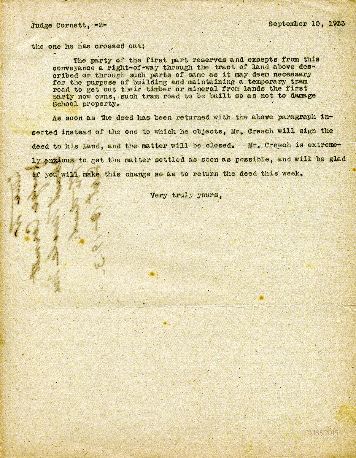September 10, 1913. [unsigned] KP to Judge Cornett. Sends him deed between Kentweva and Wm. Creech, Sr. with objectionable clause (about temporary tram road across the land) crossed out; provides re-worded clause. [016-017]