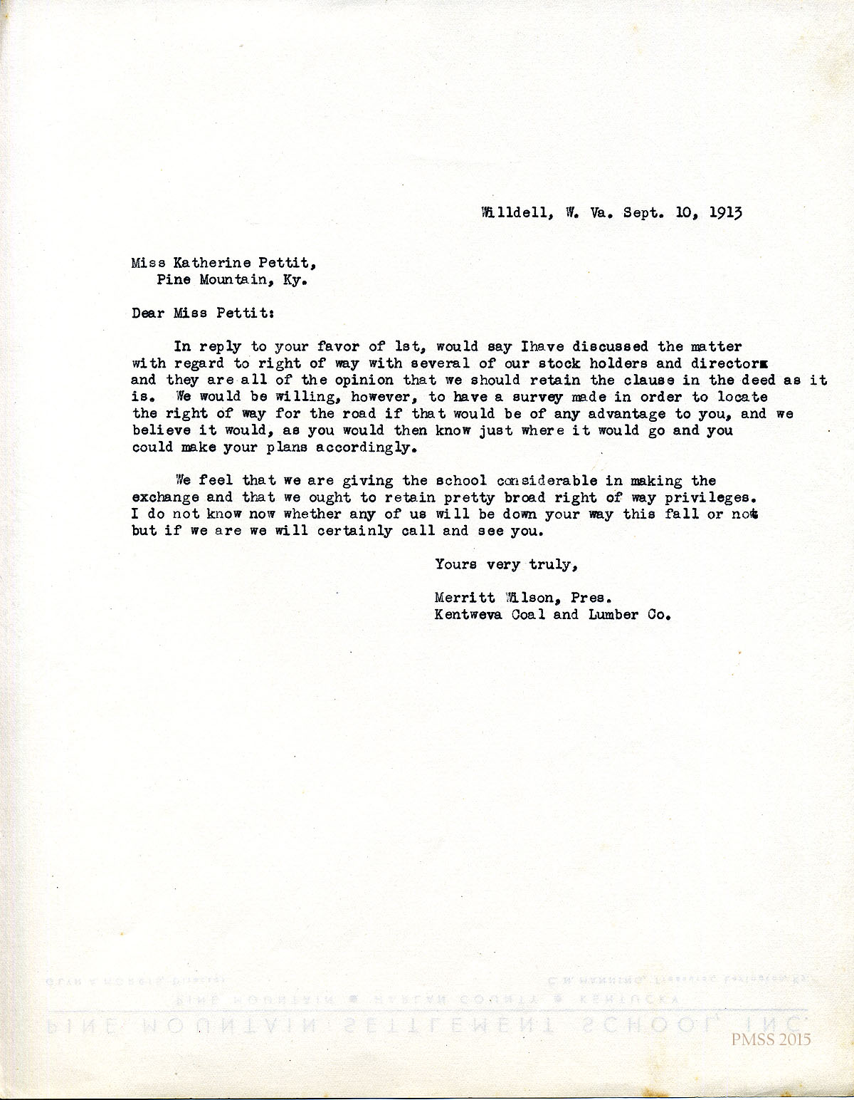 September 1, 1913. Katherine Pettit to Merritt Wilson, Kentweva Coal & Lumber Co., Wildell, W. Va. Pettit and Mr. Creech object to right-of-way clause in Kentweva’s deed. [014]