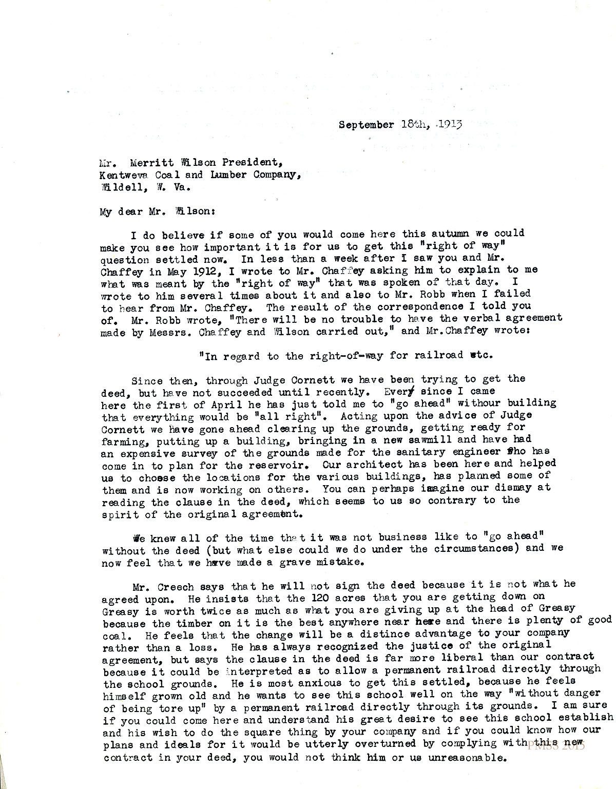 September 18, 1913. [unsigned] KP to Merritt Wilson, President, Kentweva, Wildell, W. Va. Stressed importance of a visit to P.M. by Wilson re right-of-way question; quotes explanations of right-of-way from Mr. Chaffey and Mr. Wilson; describes Wm. Creech’s fears that railroad will be permanent. [027-029]
