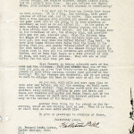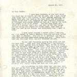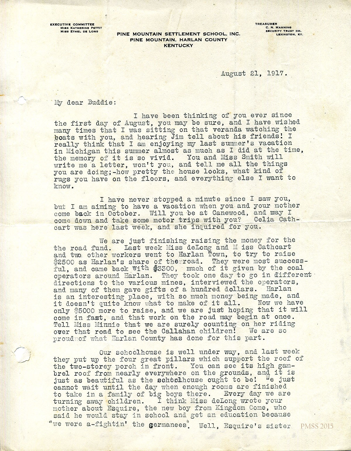 August 21, 1917 [2 pages]. Katherine Pettit to “Buddie” (Mr. Bernard Gratz Norton), Harbor Springs, MI. Reminiscences about her summer visit to Michigan; fundraising for the road; donations by Harlan mine operators; progress of schoolhouse; Laurel House; Miss Fawcett’s work with chickens and cows; canning; reservoir. Handwritten notation on second page: “Has your mother seen Mrs. Freeman – [?indecipherable]” [007-008]