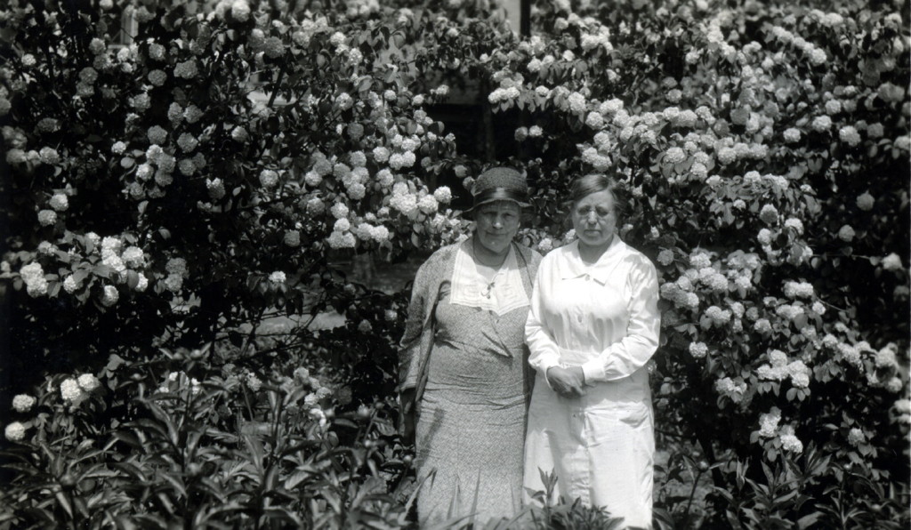 Bertha/Edith [?] Cold [?] with Dr. Ida Stapleton (to left in image) standing in front of large “snowball” bush [?] X_099_workers_2527m_mod.jpg