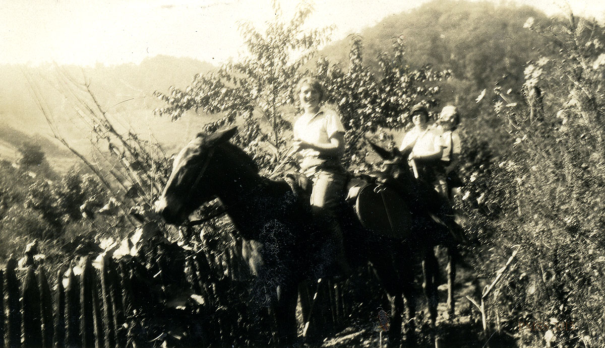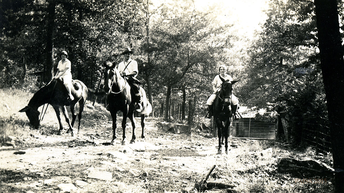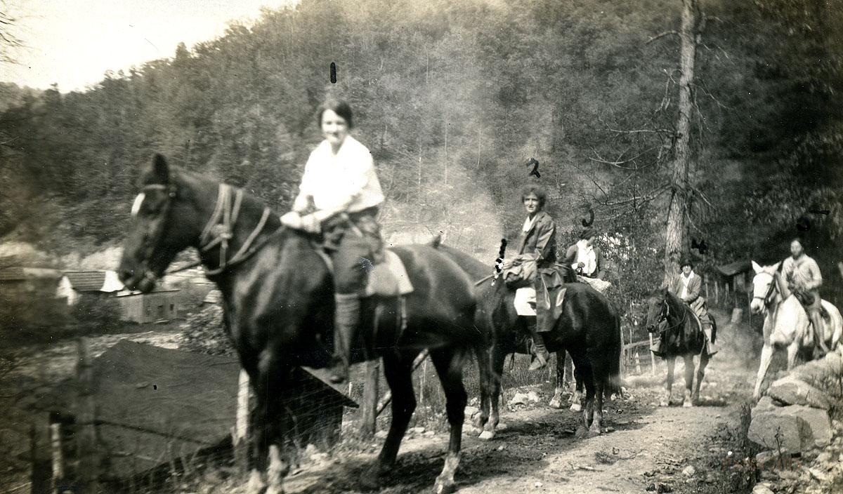 - “Harriet Crutchfield, Florence Daniels, Marian Kingman, Margaret Motter” on horseback to visit a sick man. [kingman_020a.jpg]