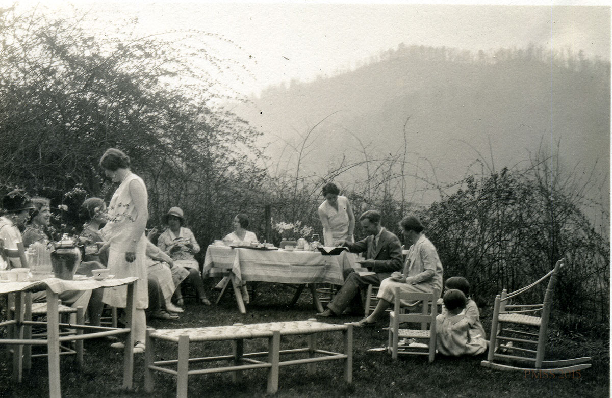 - “Breakfast at Miss Pettit’s Lean-To on Commencement Day.” Dr. Cassleman, Sally Loomis, Harriet [Crutchfield],,Margaret [Motter],unk ?, Marian [Kingman], Mrs. Kratz, Mrs. Loomis, Kay Wright, ??. [kingman_075b]