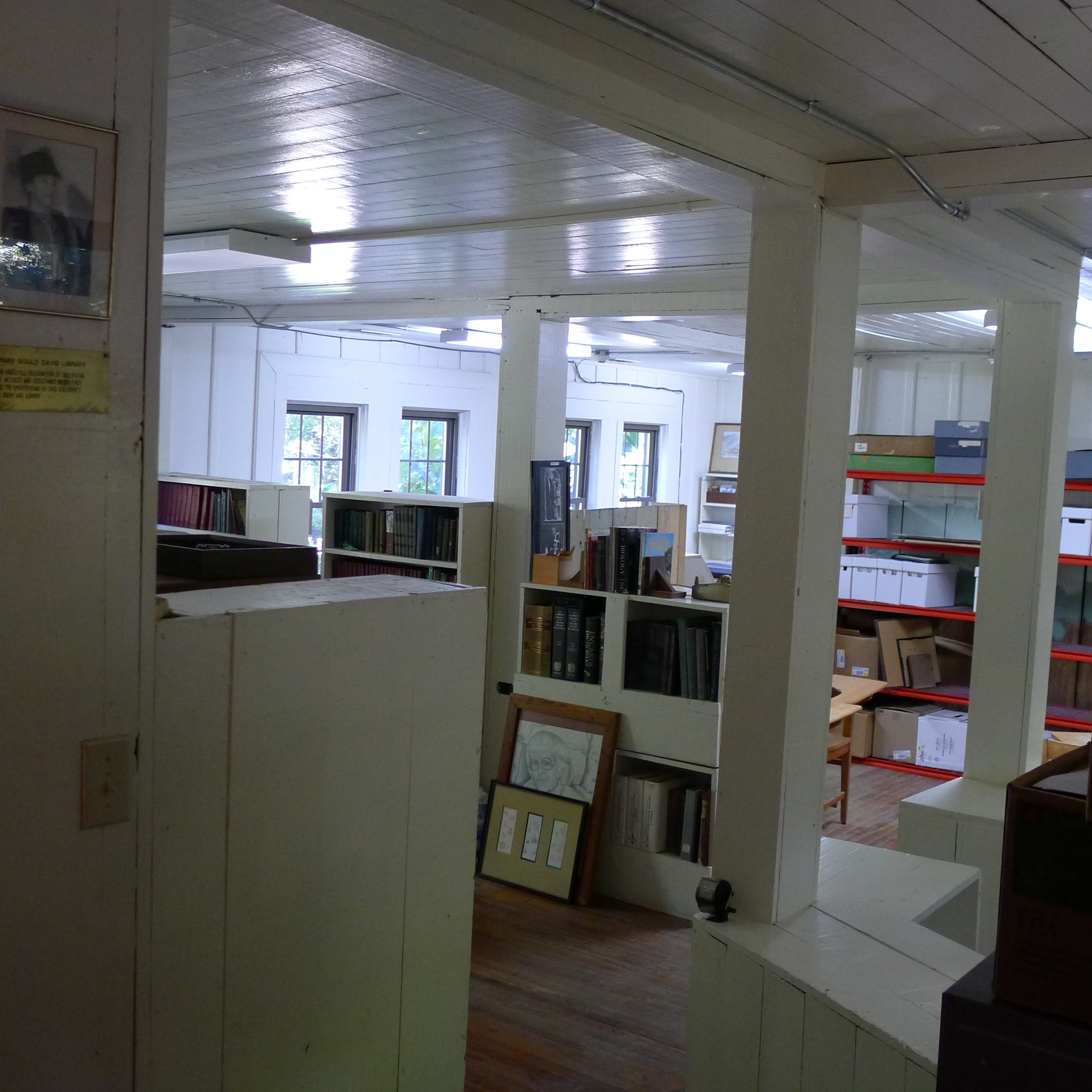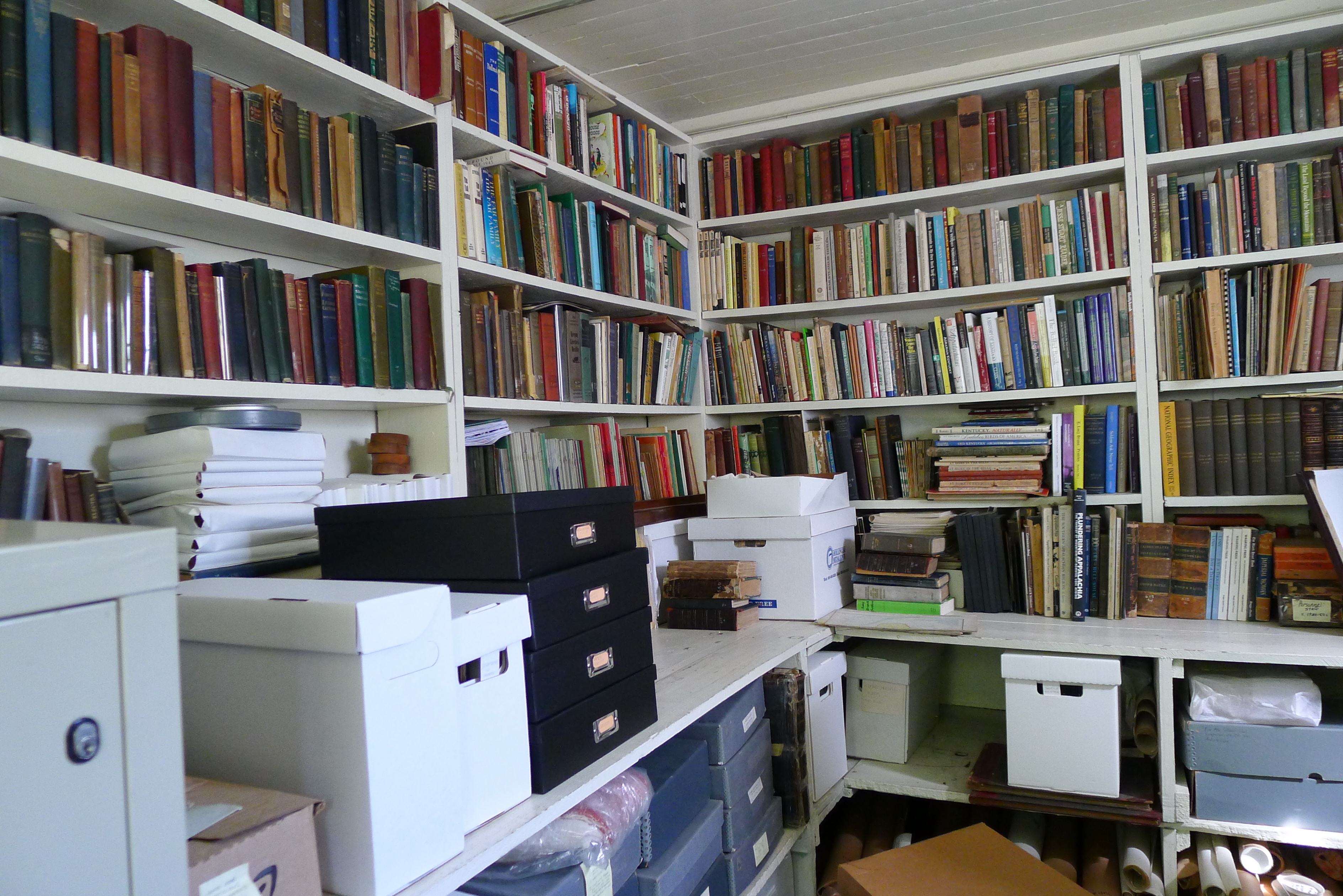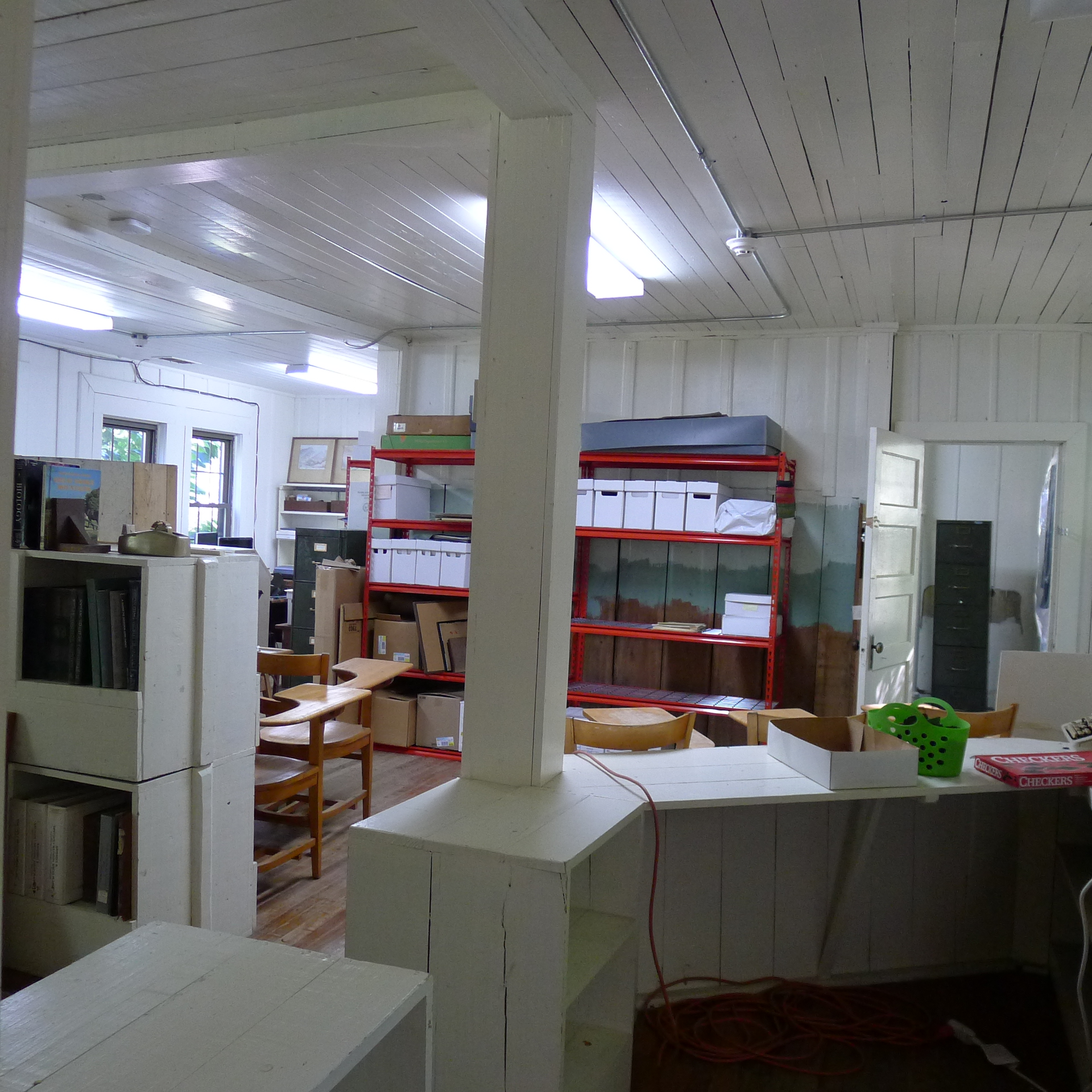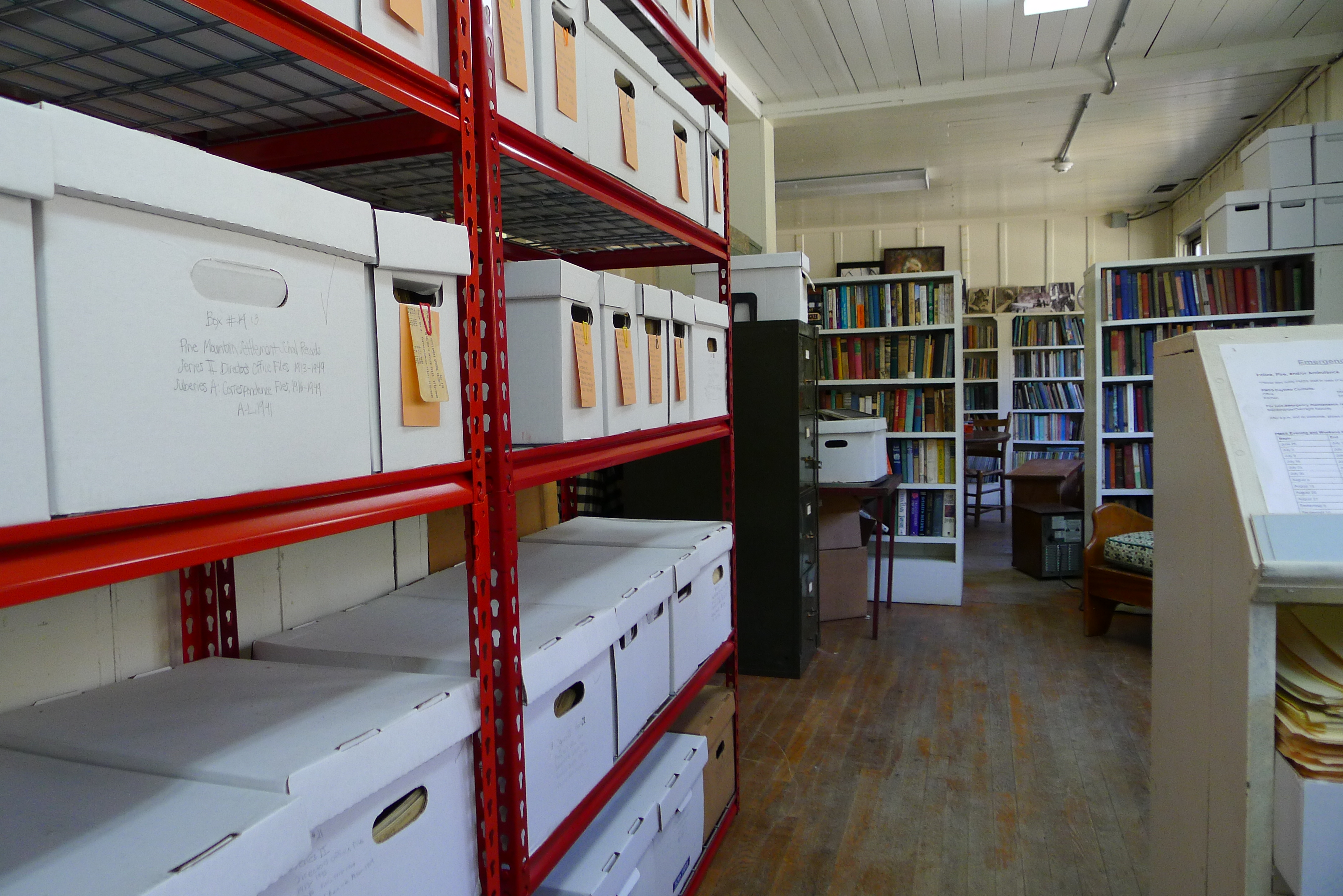 The Library conference room, formerly a gymnasium and later a weaving room, has been converted to a large meeting room as well as housing the Native American collections used in EE instruction.  The original library book collections stored in the gymnasium area have been thinned and removed to the Library shelving area. Collections that focus on the EE botanical program (E.J. Carr Botanical Collection – Books) will be moved to the Boys House/Library where there will be more bibliographic control of the material. Some West Wind holdings, such as financial records will remain at West Wind for the present time, and only materials critical for researchers will be moved to the new archival space in Boys House. Specifically, this will include the processed materials of the Berea microfilm project.