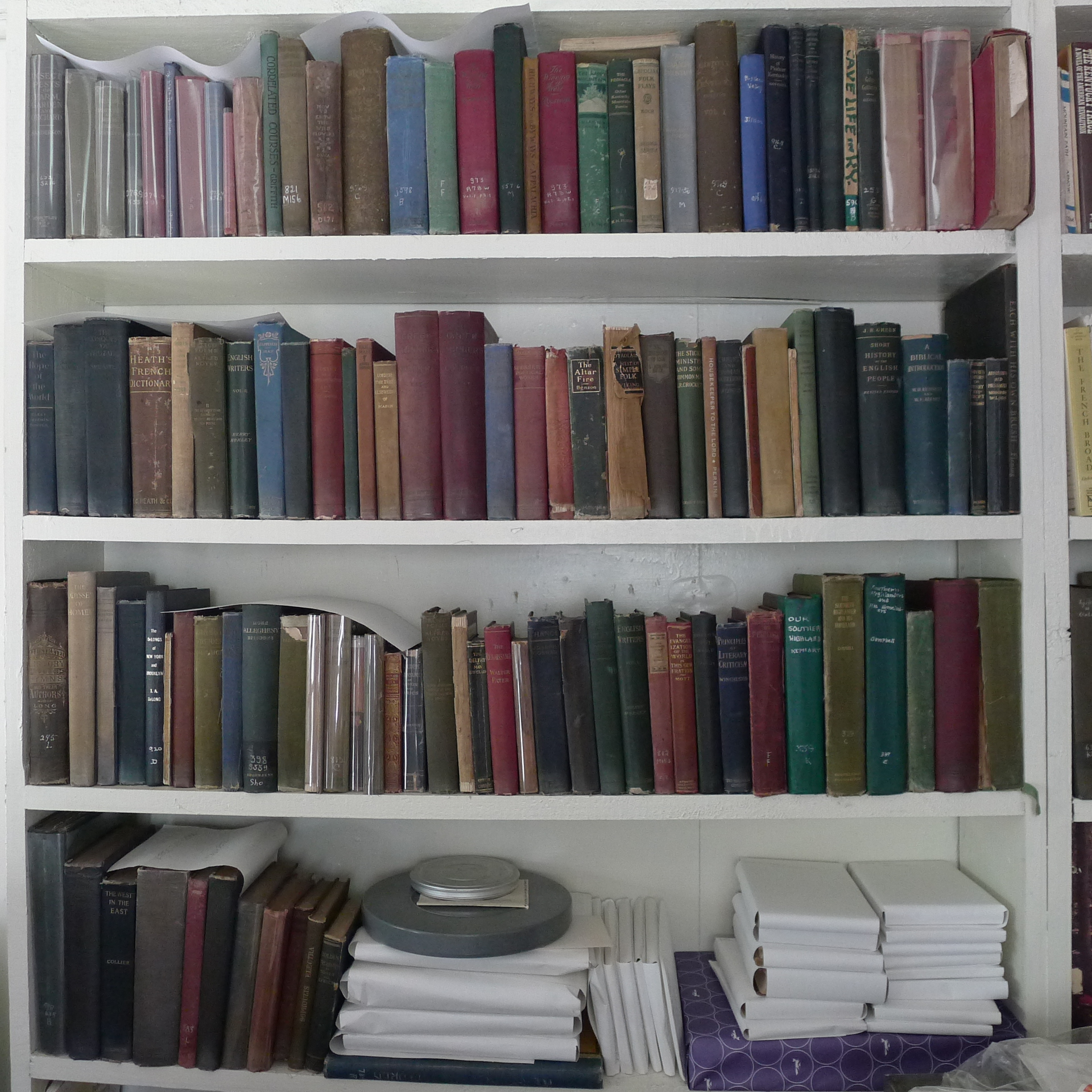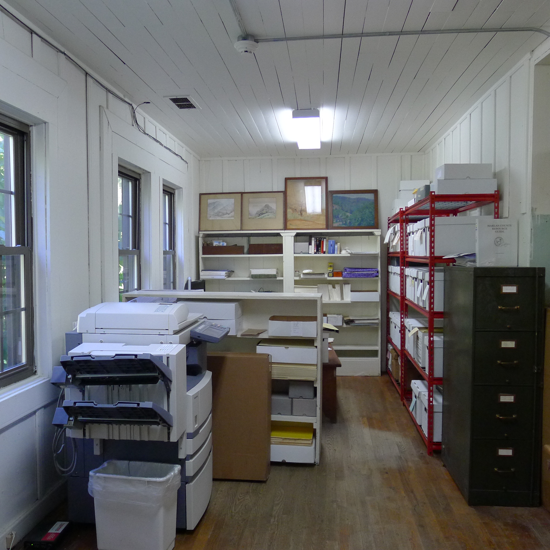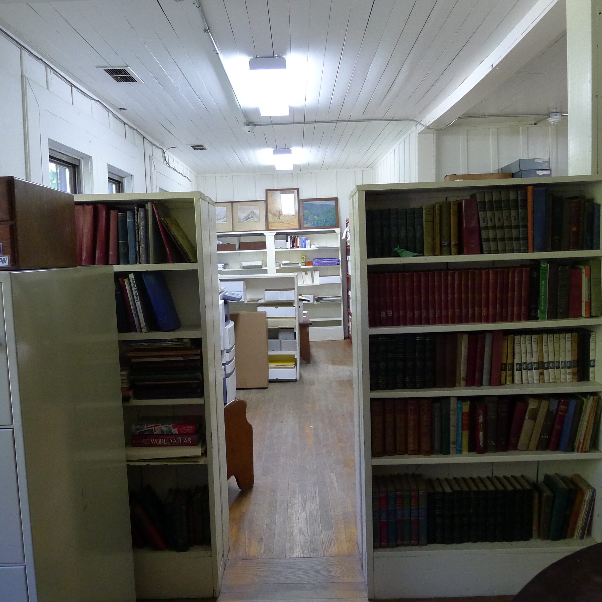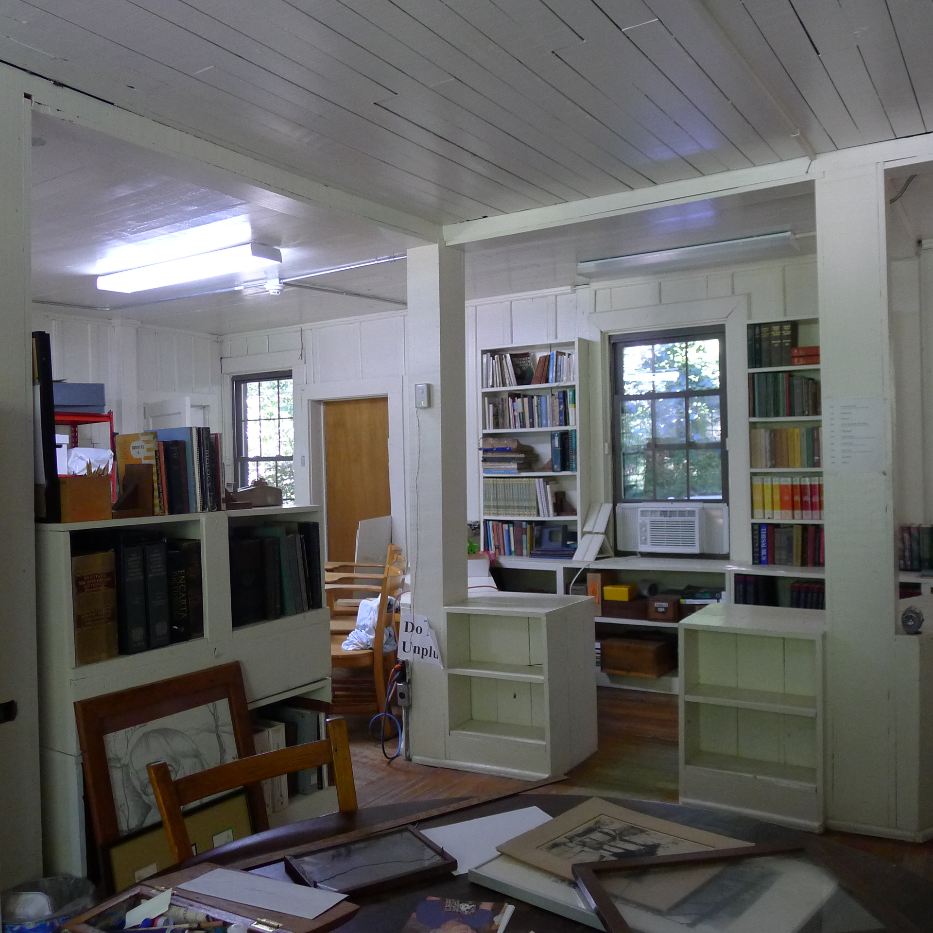 The Library conference room, formerly a gymnasium and later a weaving room, has been converted to a large meeting room as well as housing the Native American collections used in EE instruction.  The original library book collections stored in the gymnasium area have been thinned and removed to the Library shelving area. Collections that focus on the EE botanical program (E.J. Carr Botanical Collection – Books) will be moved to the Boys House/Library where there will be more bibliographic control of the material. Some West Wind holdings, such as financial records will remain at West Wind for the present time, and only materials critical for researchers will be moved to the new archival space in Boys House. Specifically, this will include the processed materials of the Berea microfilm project.