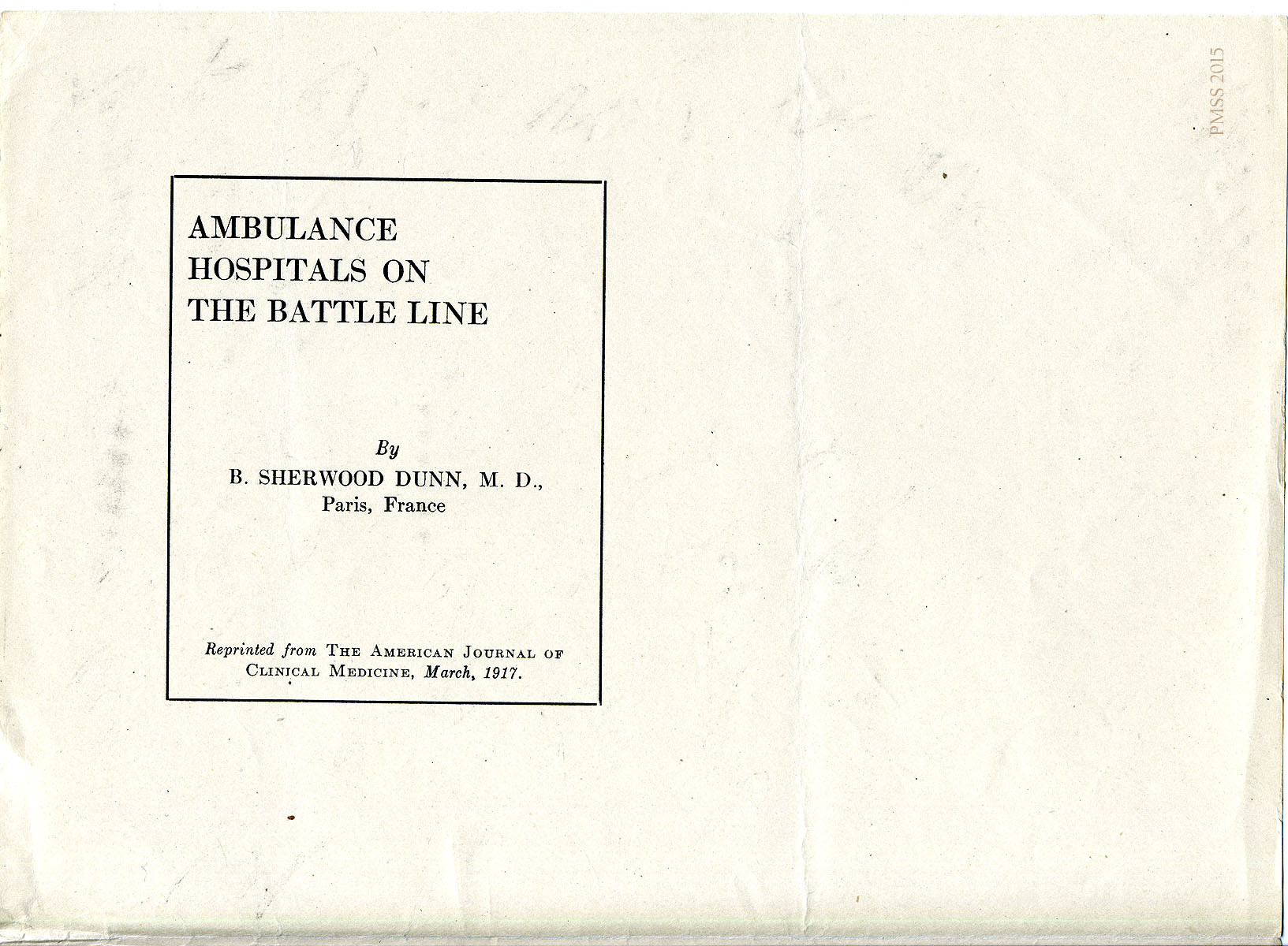 n.d. Cover page for “Ambulance Hospitals on the Battle Line” by B. Sherwood Dunn, M.D., Paris France. Reprinted from The American Journal of Clinical Medicine, March, 1917. [052]