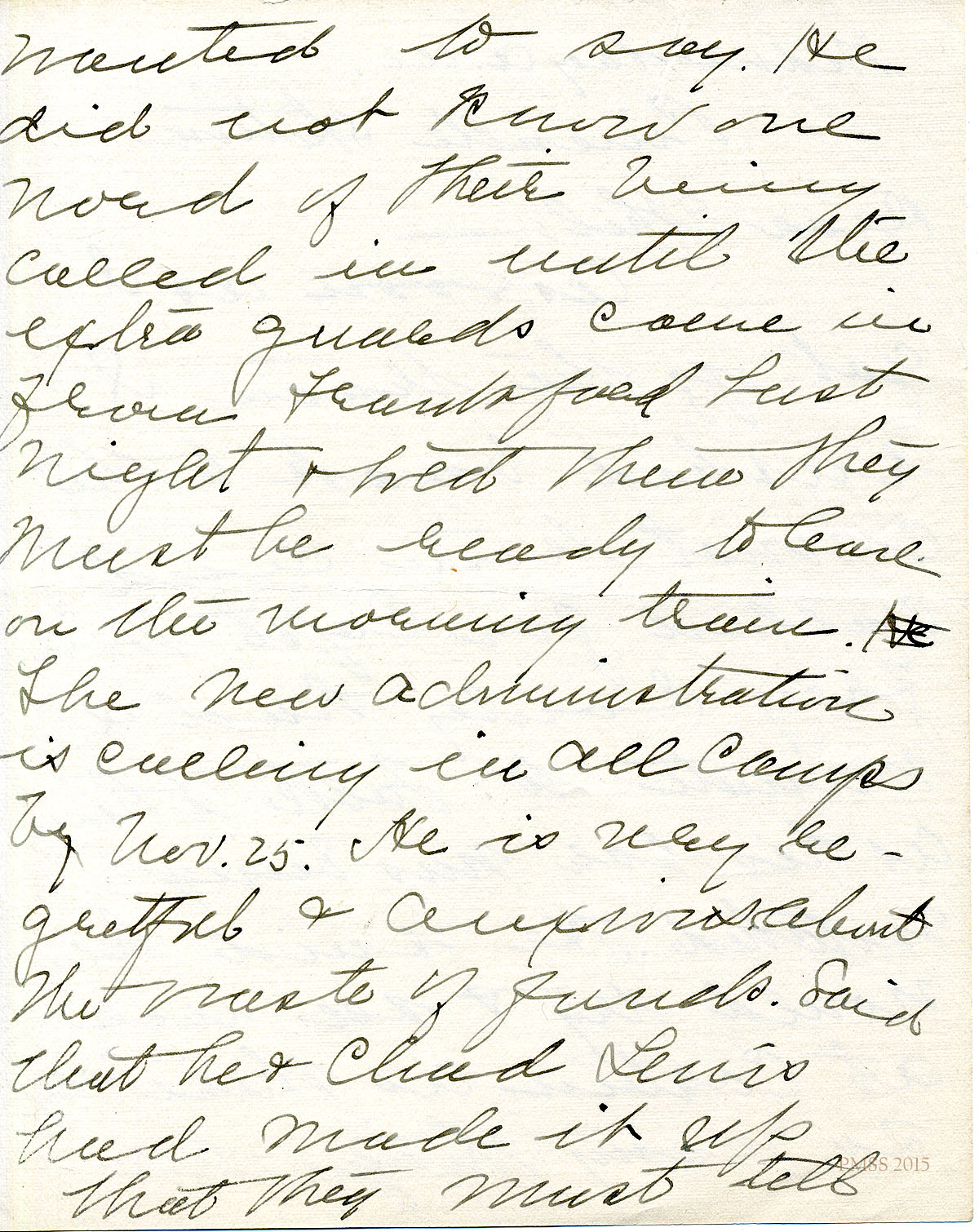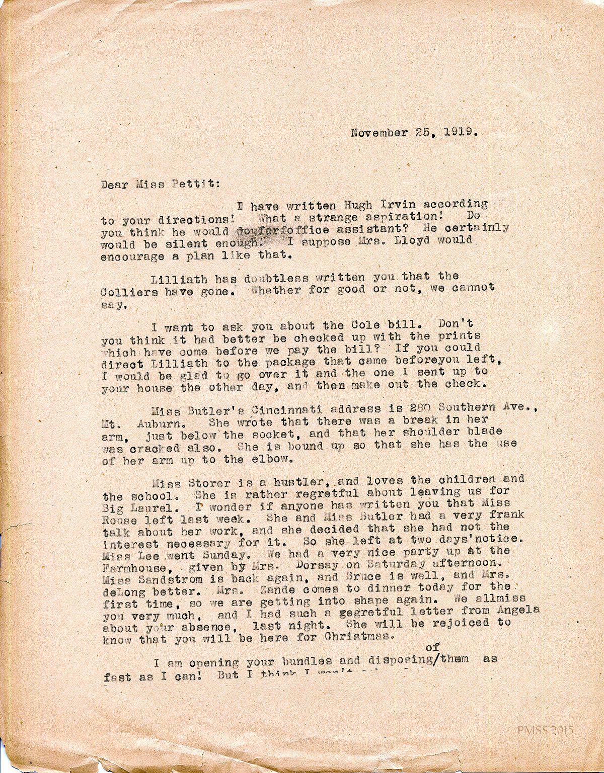 November 25, 1919. [?] to Katherine Pettit. [1 page, incomplete]. Wrote to Hugh Irvin; Asks about the “Cole bill”; Miss Butler’s address and injury; updates about other workers: Miss [Emily] Storer, Miss Rouse, Miss Lee, Mrs. Dorsay, Miss Sandstrom. “Mrs. Zande comes to dinner today for the first time…” [057]