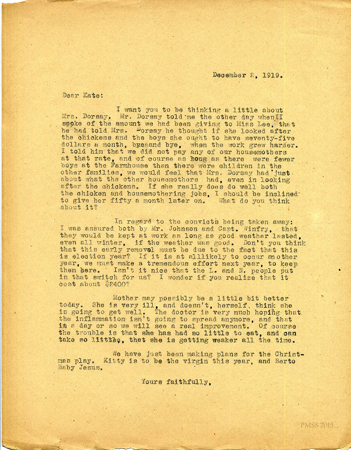 December 2, 1919. Ethel de Long Zande to “Kate” (Katherine Pettit) [1 page, unsigned]. Regarding Mrs. Dorsay’s salary for working with chickens and as housemother; convicts working all winter; L & N donated switch; and mother’s illness; Christmas play plans with Kitty as Virgin Mary and Berto [Zande] as Baby Jesus. [059]
