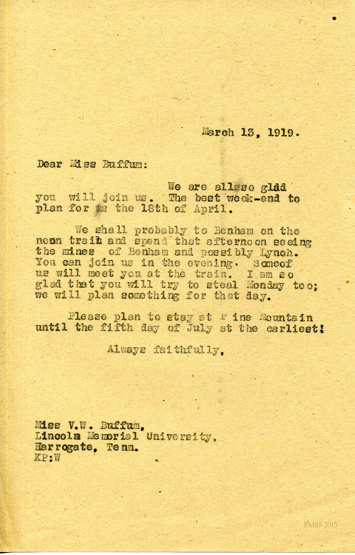 March 13, 1919. KP to Miss V. W. Buffum, Lincoln Memorial University [1 half-page, unsigned]. Glad that Miss Buffum will join excursion; provides itinerary. [003]