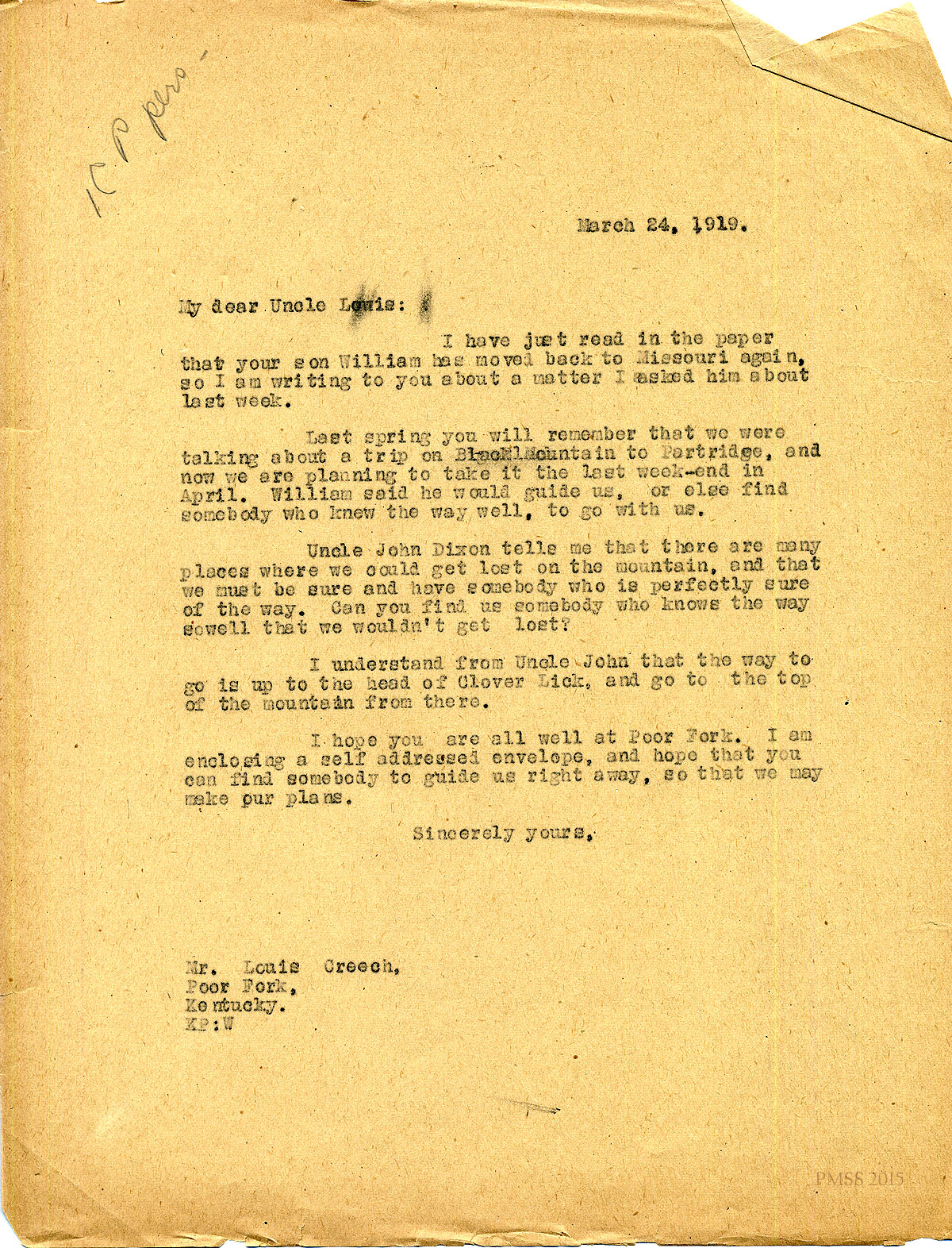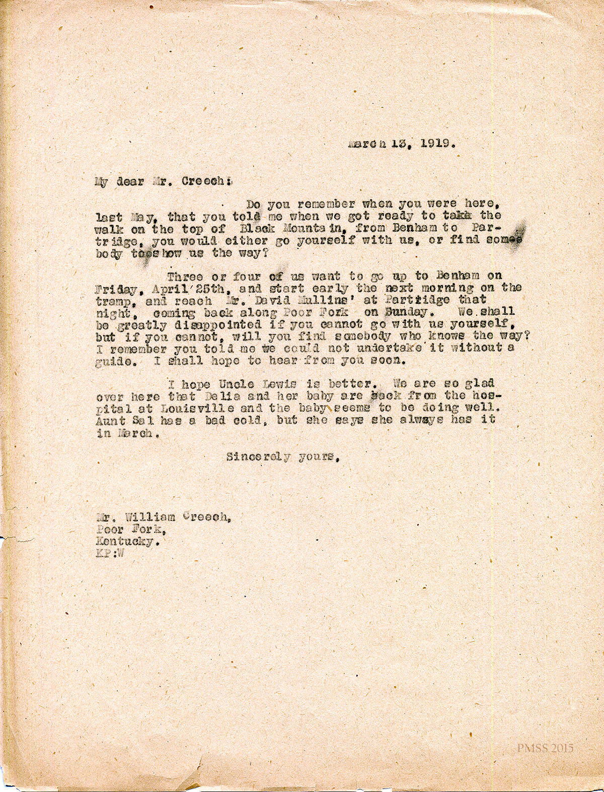 March 13, 1919. KP to William Creech [Jr.?], Poor Fork, KY [1 page, unsigned]. Invites Mr. Creech to join Black Mt. hike from Benham to Partridge or provide guide; Mentions Uncle Lewis, Delia and baby, Aunt Sal. [004]