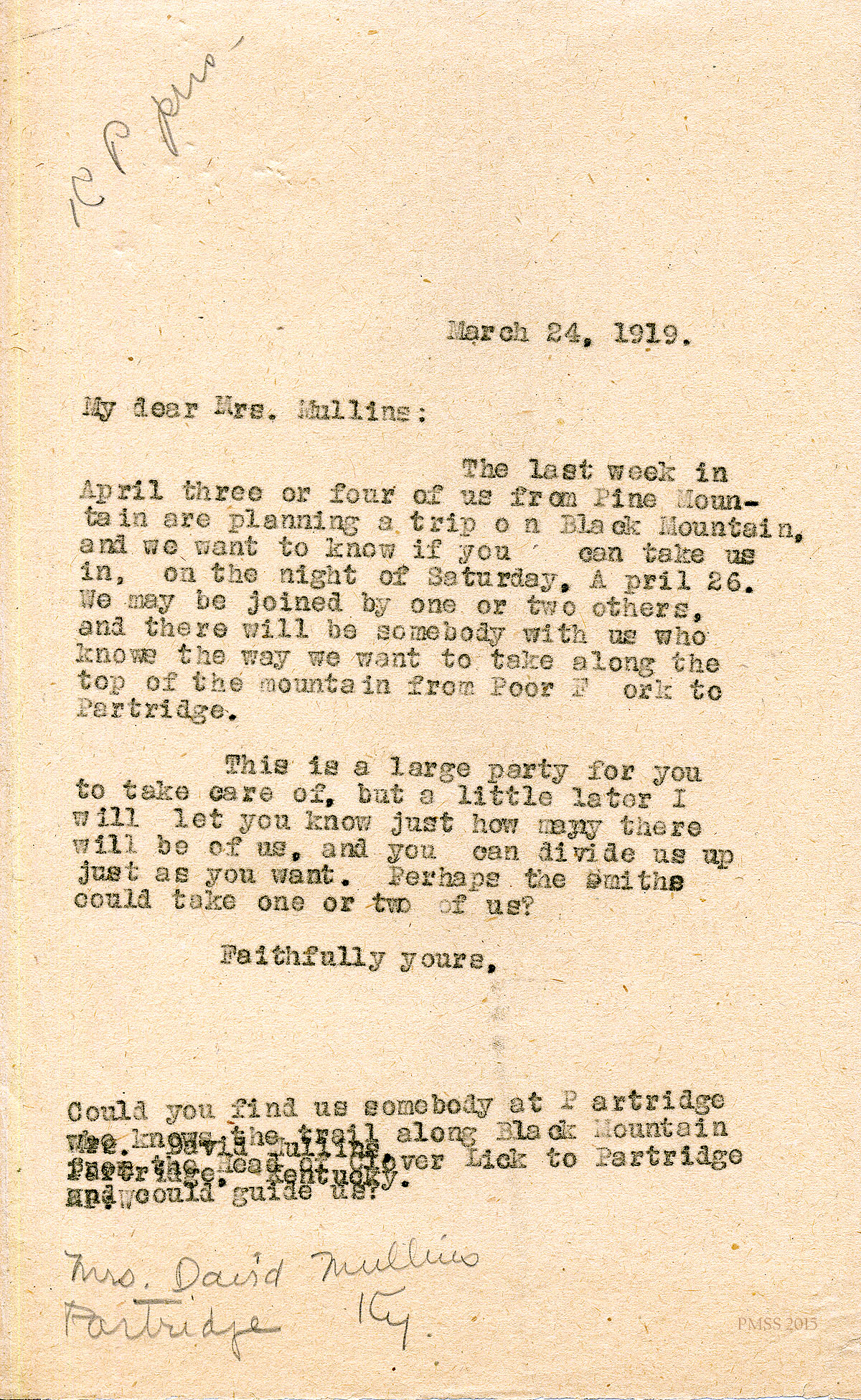 March 24, 1919. KP to Mrs. David Mullins, Partridge, KY [1 half-page, unsigned]. Asks Mrs. Mullins if the group of Black Mt. hikers plus guide can stay overnight. [007]