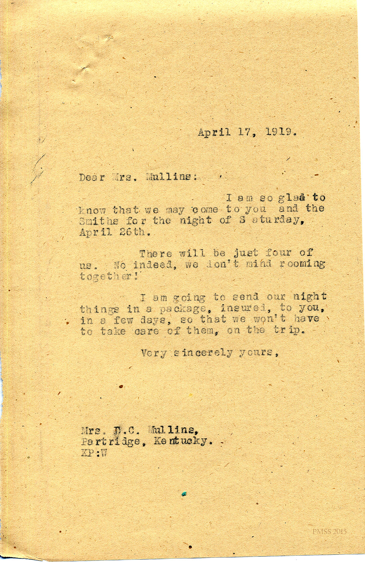 April 17, 1919. KP to Mrs. David Mullins, Partridge, KY [1 half-page, unsigned]. Glad that the hiking group can stay overnight at Mrs. Mullins and the Smiths. [010]