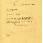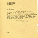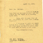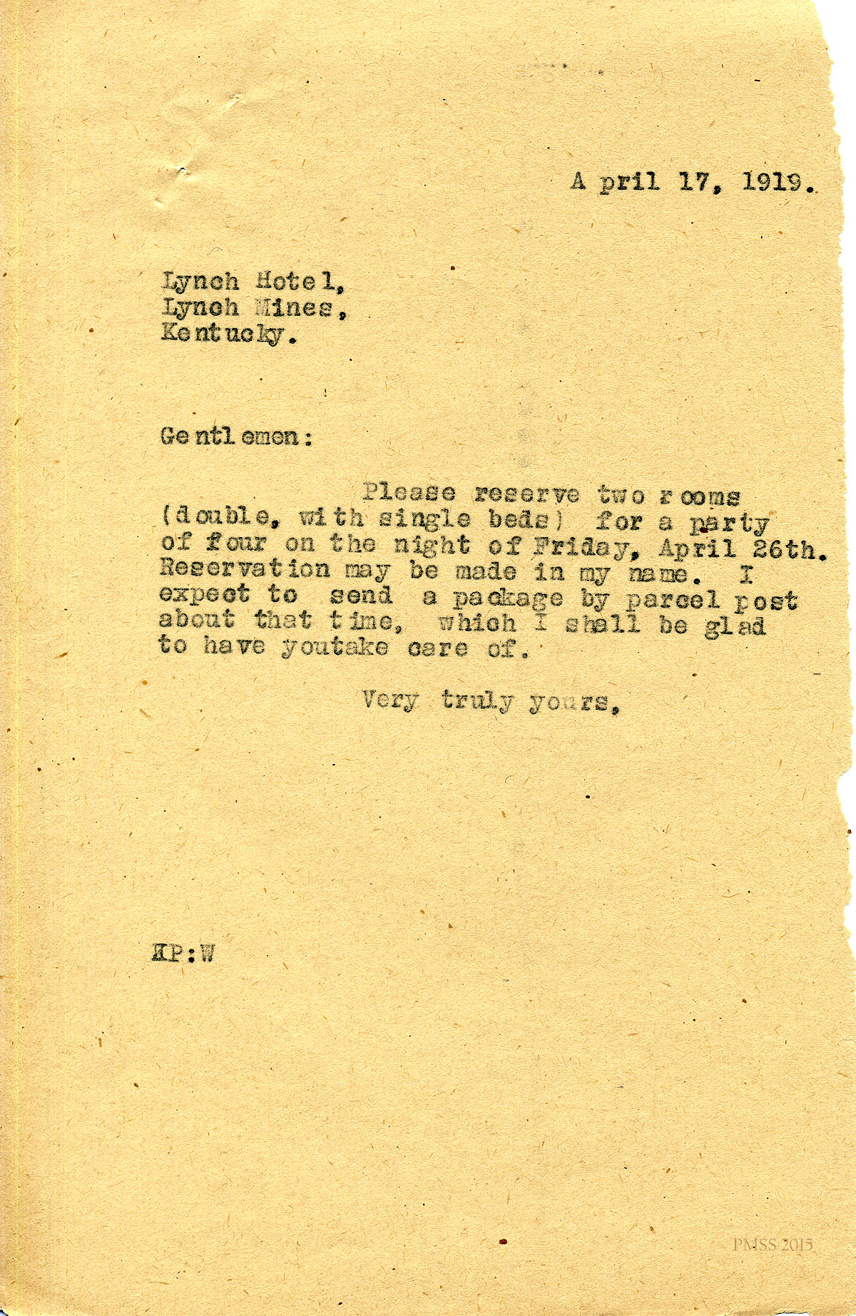 April 17, 1919. KP to “Gentlemen”, Lynch (KY) Hotel [1 half-page, unsigned]. Requested room reservations for four on April 26. [011]