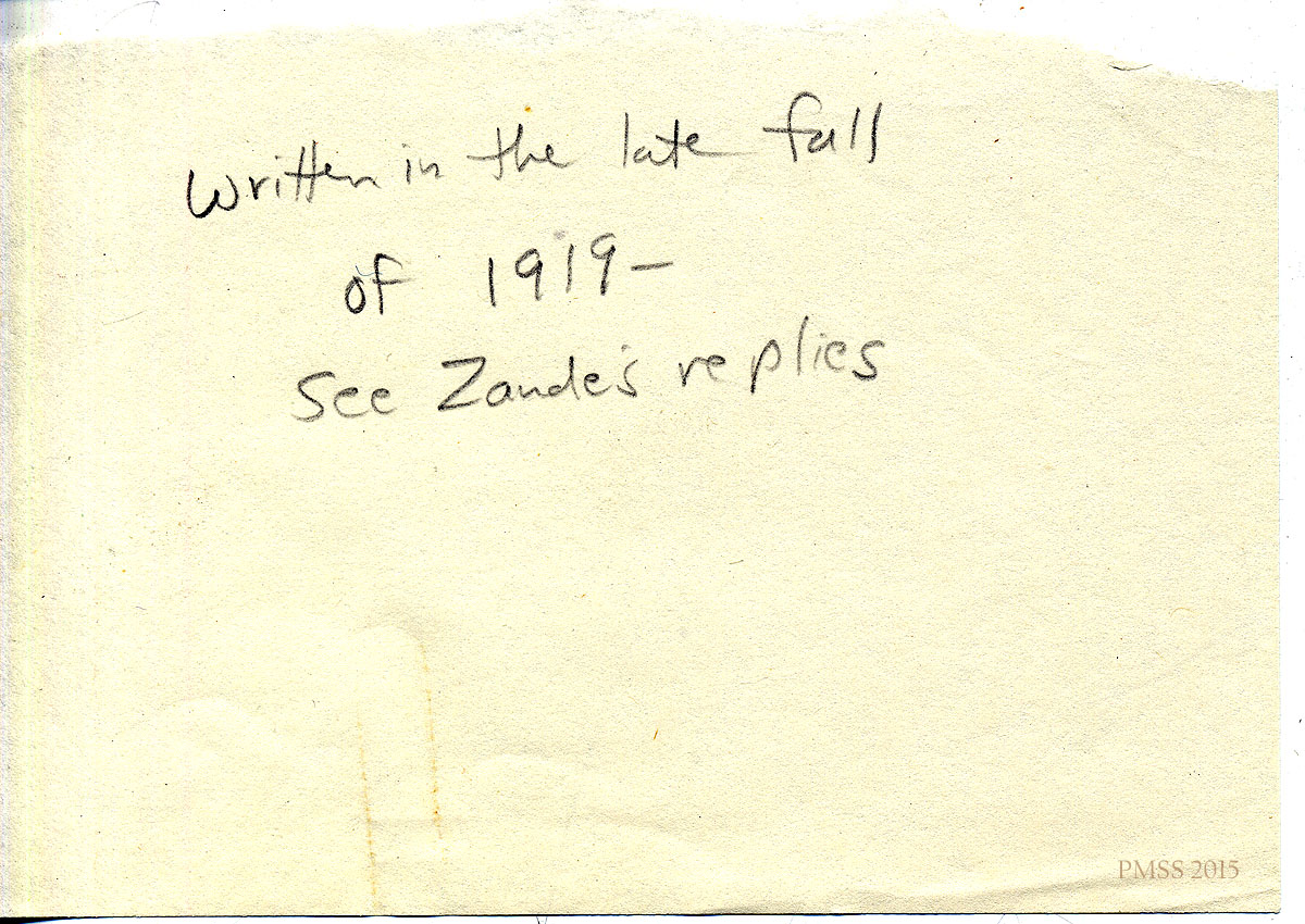 Handwritten note: “Written in the late fall of 1919 — See Zande’s replies.” [012]