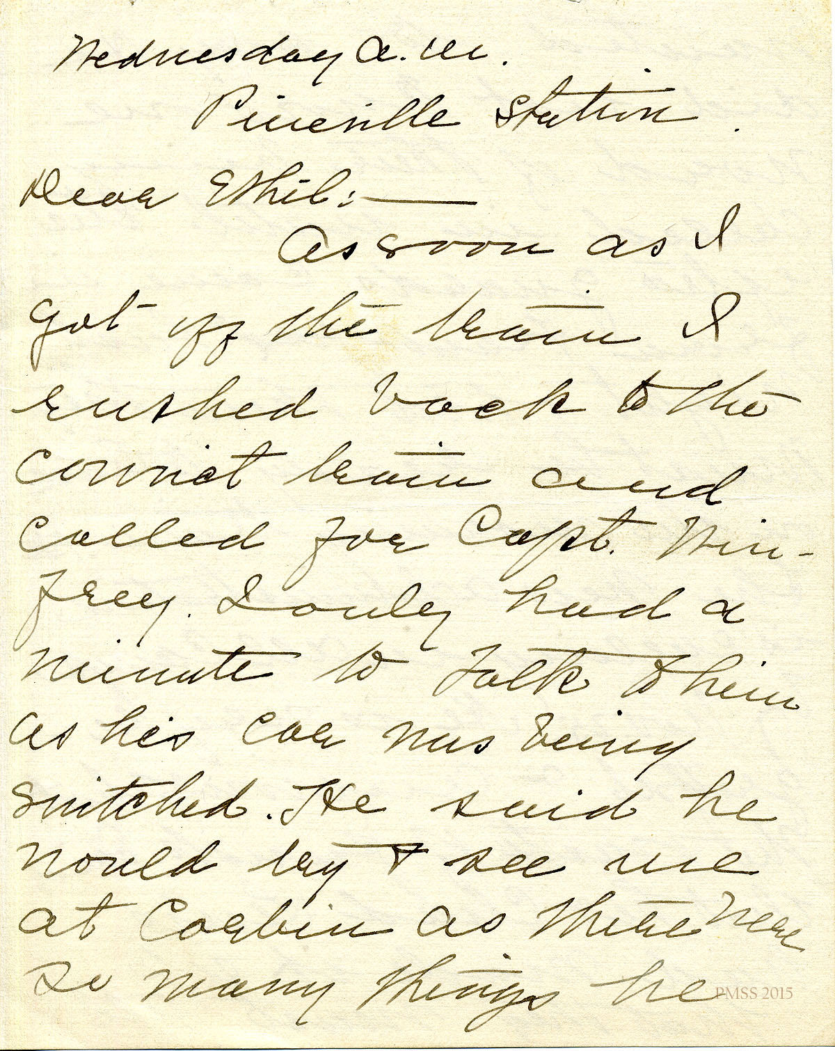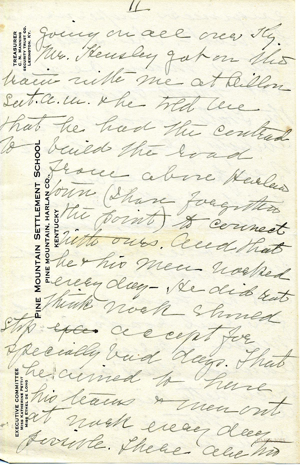 n.d., [probably late Fall] 1919 (Wednesday). Katherine Pettit, Pineville Station, to “Ethel” [Zande?] [18 handwritten pages]. Talked briefly with Capt. Winfry on the train about being hired as road foreman; suggests names of those she could approach for help concerning the road, but will need more information to do so; Ethel should talk with Chad Lewis about money being wasted; suggests building a community center. [019-037]
